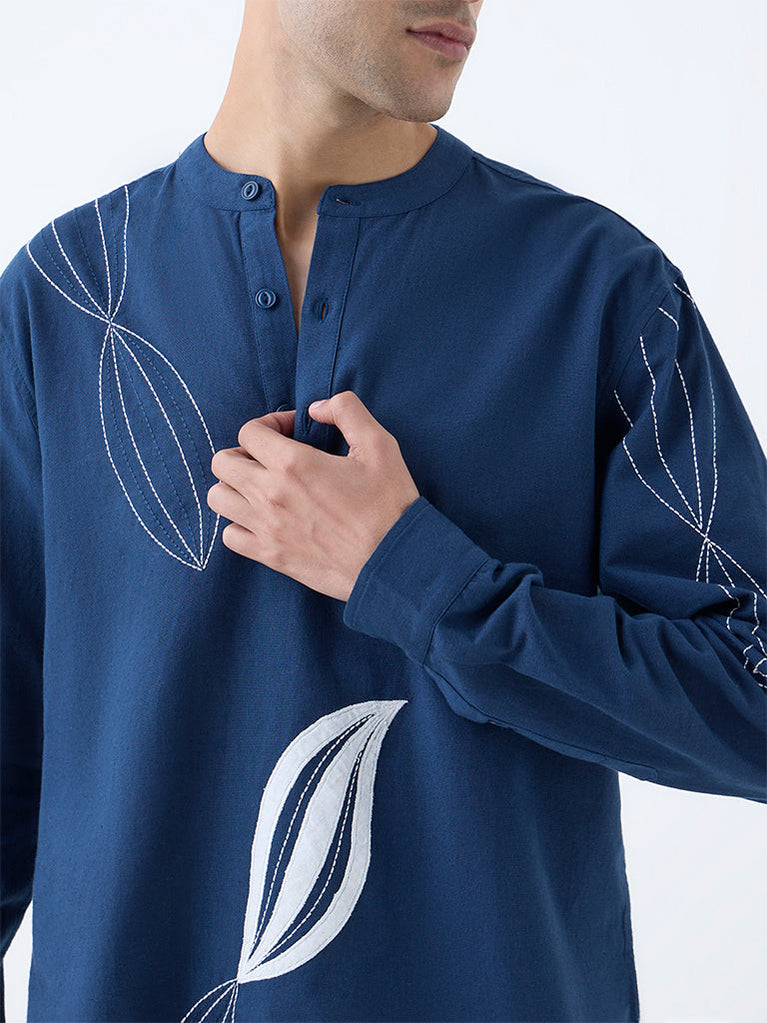Make every outing effortlessly stylish with this indigo shirt from ETA. Showcasing abstract embroidery on a relaxed silhouette, it blends contemporary design with casual ease. Structured with a mandarin collar, button placket, and full sleeves, the cotton-rich garment ensures utmost comfort from AM to PM.