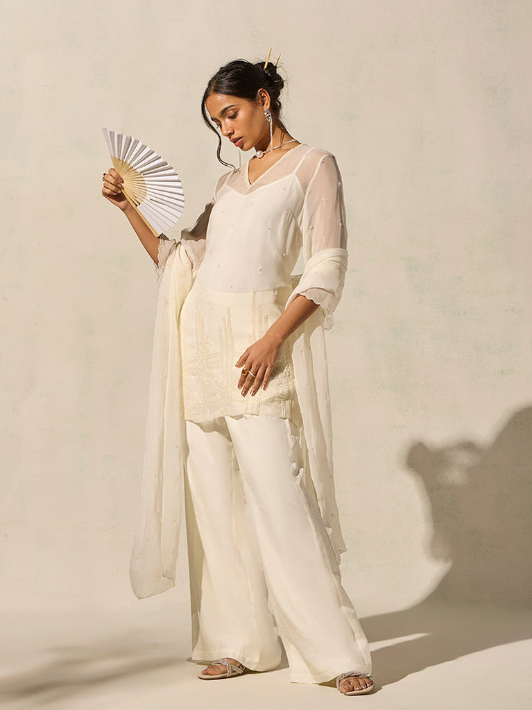Built for festive evenings that unfold at their own rhythm, this four-piece kurta set brings elegance with ease. The sheer kurta is detailed with embellished beadwork across the front and shaped with a flattering V neckline and three-quarter sleeves finished with delicate scalloped edges. Layered over a soft camisole for comfortable coverage, it pairs with fluid straight-leg pants designed with a discreet side zipper and an elasticated waistband for all-day comfort. A matching dupatta completes the ensemble, allowing it to move effortlessly through celebrations and intimate gatherings.