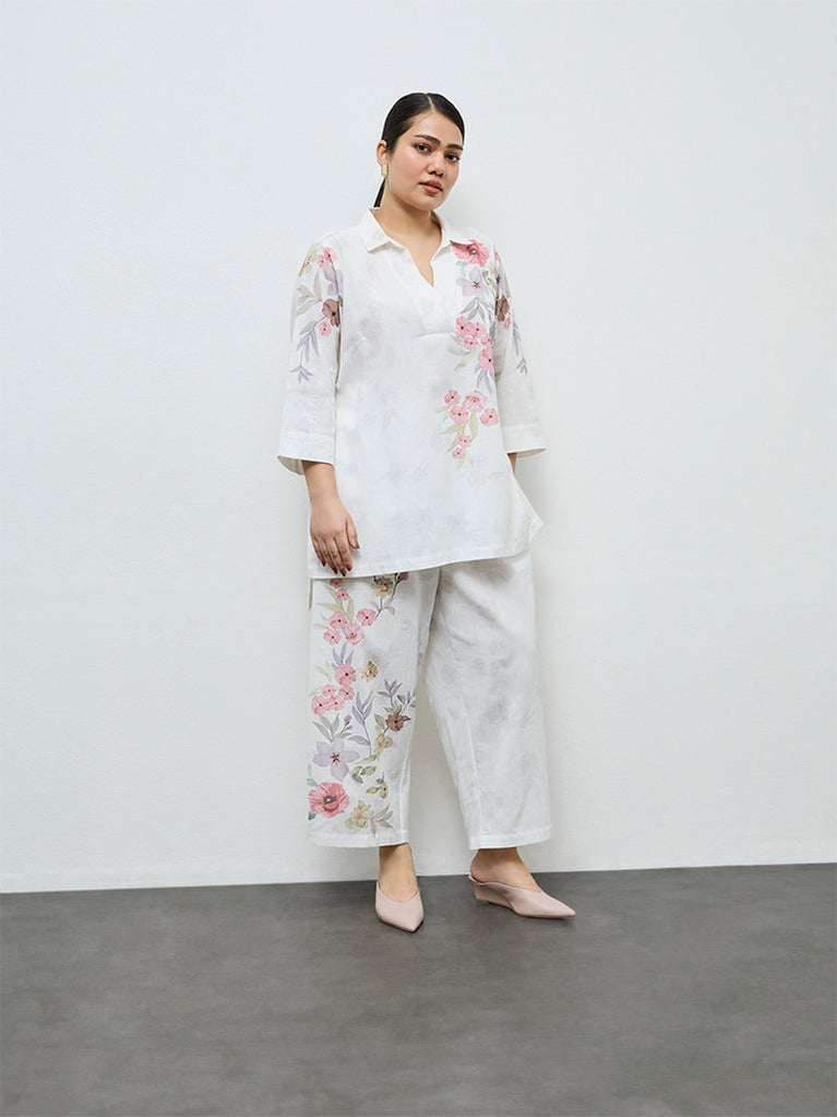 Diza White Floral Design Cotton-Blend Pants