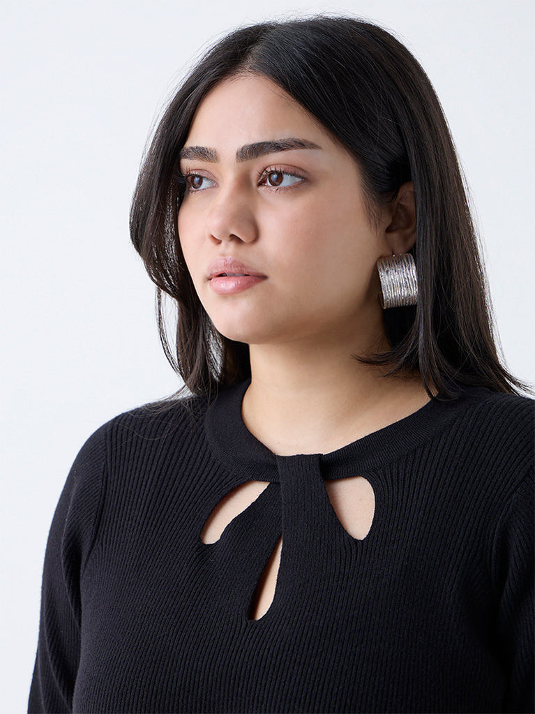 Gia launches this black sweater with a fashion-forward cut-out design that adds striking appeal. The ribbed knit fabric ensures stretch and comfort, while the round neck and full sleeves keep the profile sleek and wearable.