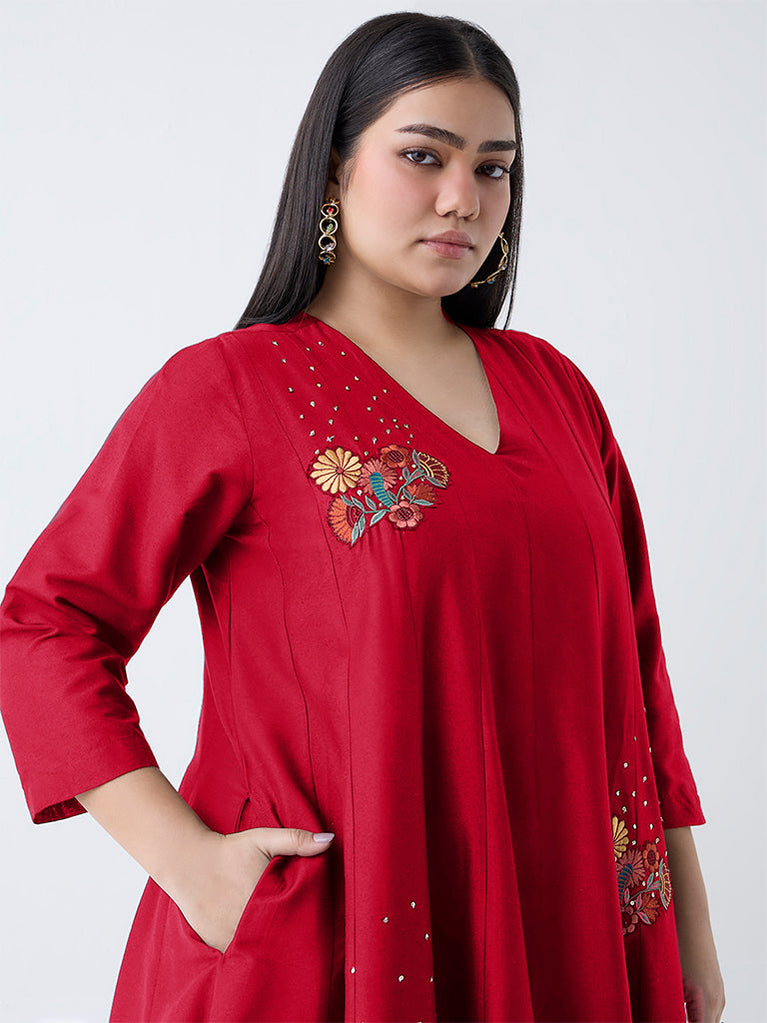Infused with artisanal grace, this red kurta by Diza is detailed with floral embroidery and subtle embellishments for a festive sparkle. The Anarkali silhouette flows elegantly, balanced by a flattering V-neck and three-quarter sleeves. Side pockets add a modern touch of ease to this traditional design.