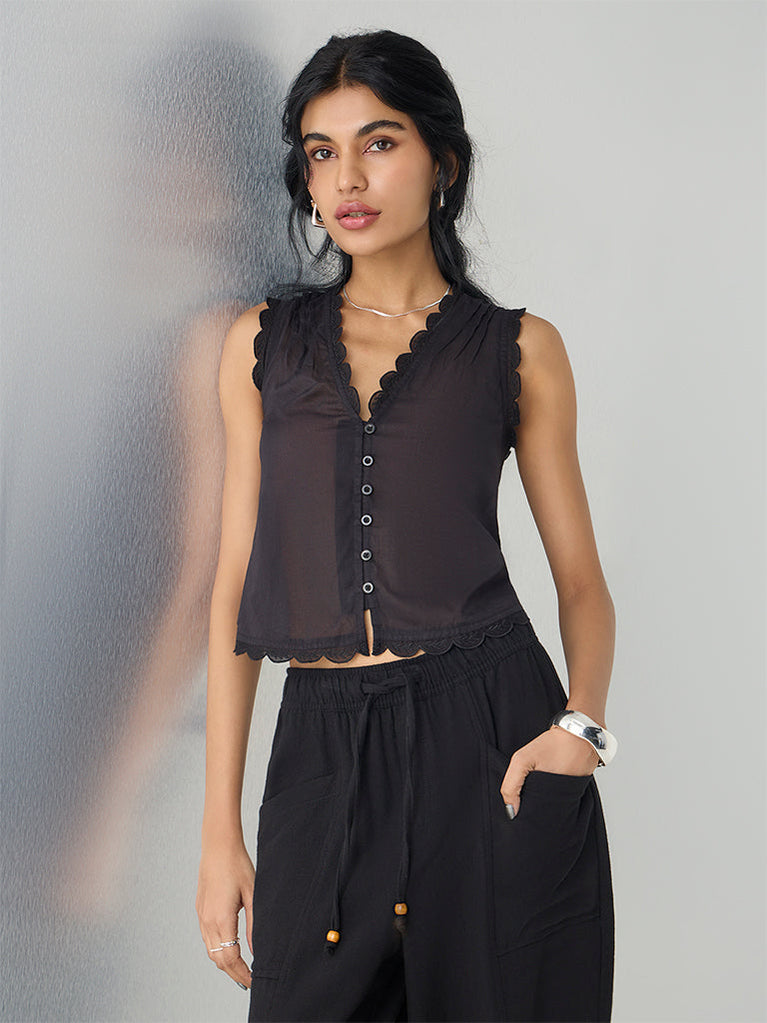 Bombay Paisley elevates everyday staples with this sheer black top. Scalloped edges at the V-neck and a buttoned front bring structure, contrasted by a tasselled knot tie at the back that channels playful ease. A versatile layer for Indo-Western styling.