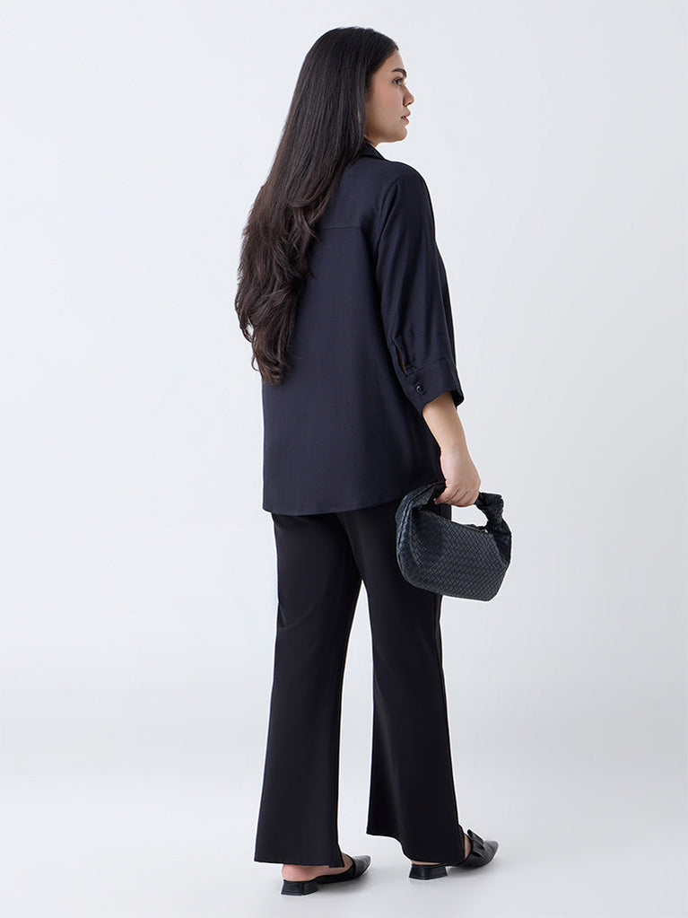 Elevate your wardrobe with this black shirt from Gia, beautifully accented with delicate floral embroidery. Designed with a chic notched collar that flows into a button-down front and three-quarter sleeves, it combines timeless elegance with modern sophistication.