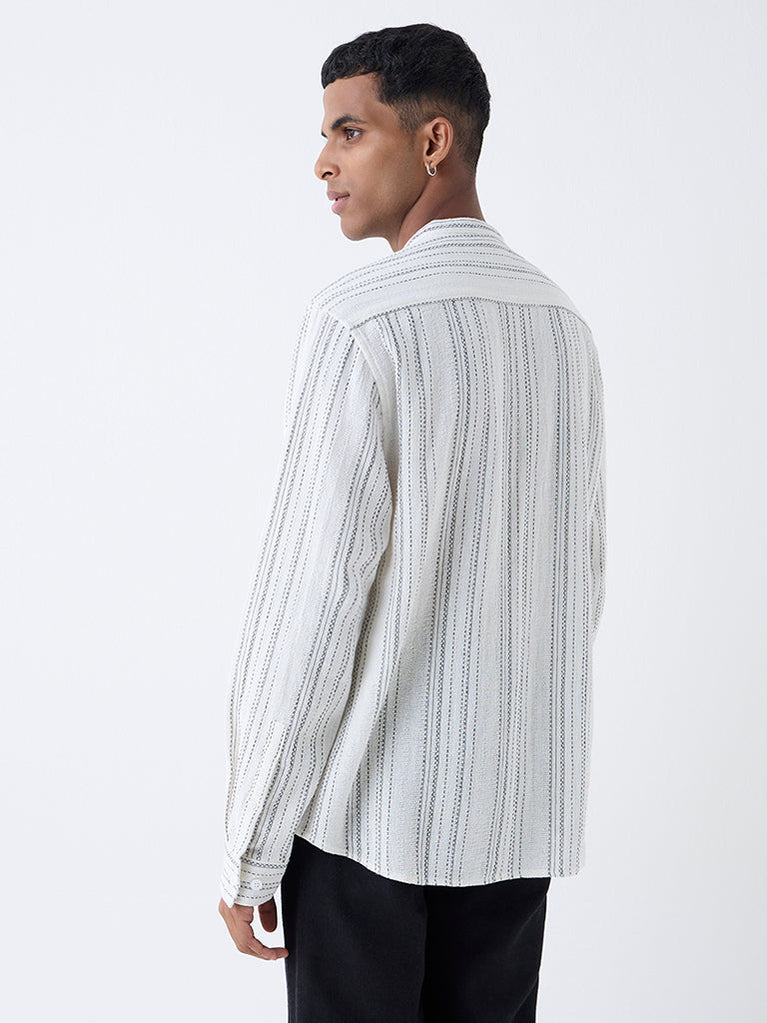 ETA brings this off-white shirt, constructed from lightweight fabric for all-day comfort. Featuring embroidered stripes on a relaxed form, it is styled with a band collar, a button-up front and full sleeves. A refined essential that pairs easily with understated style.