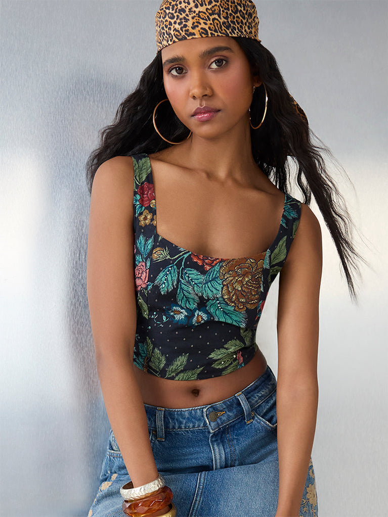 Diza Black Floral Embroidered Anarkali Kurta