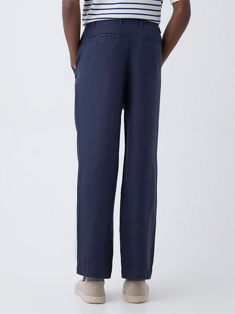Ascot Indigo Solid Relaxed-Fit Mid-Rise Linen Trousers