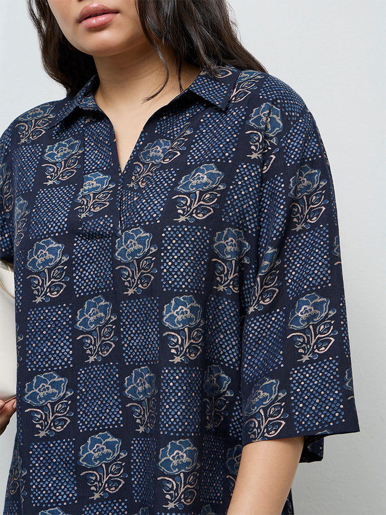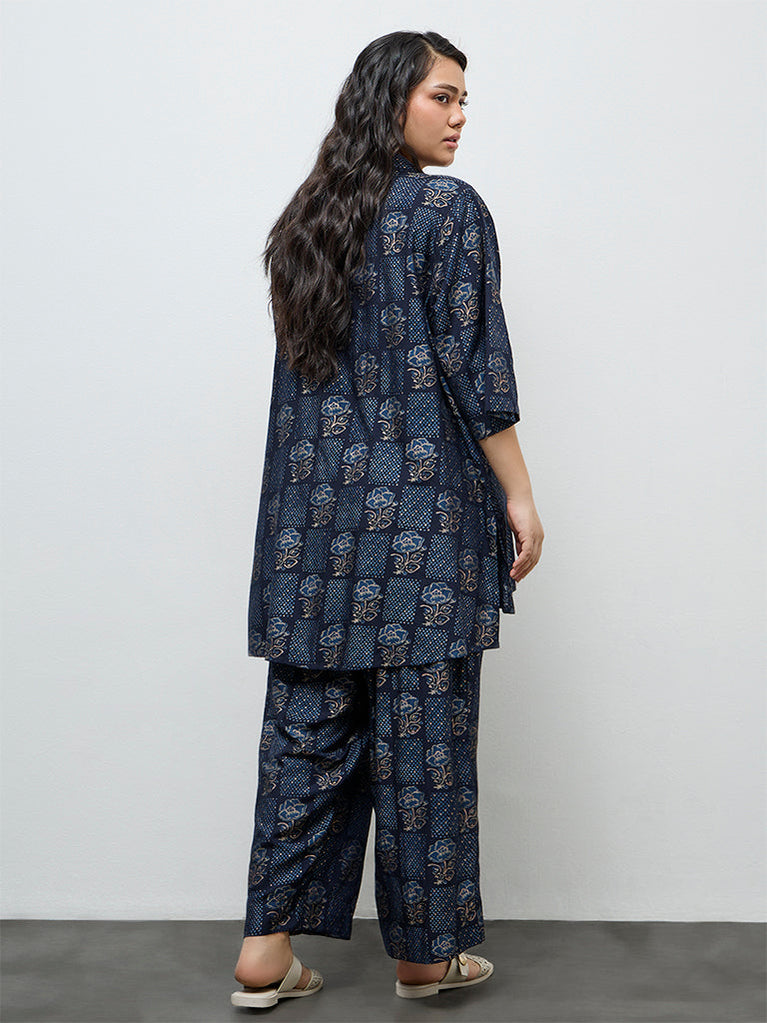 Diza Indigo Floral Embroidered Cotton A-Line Kurta