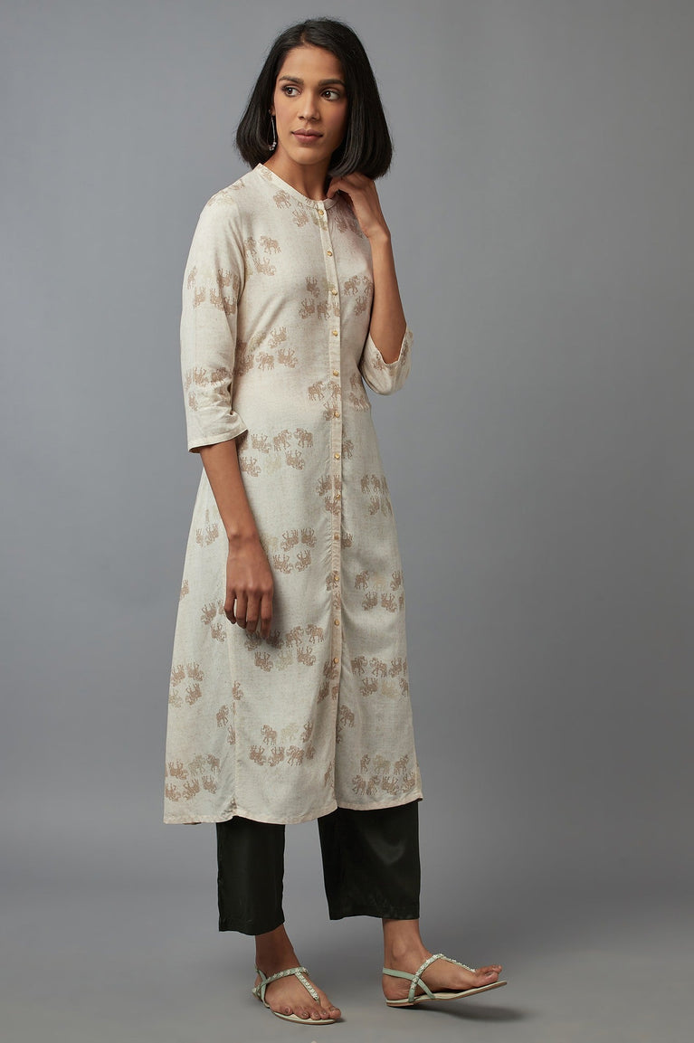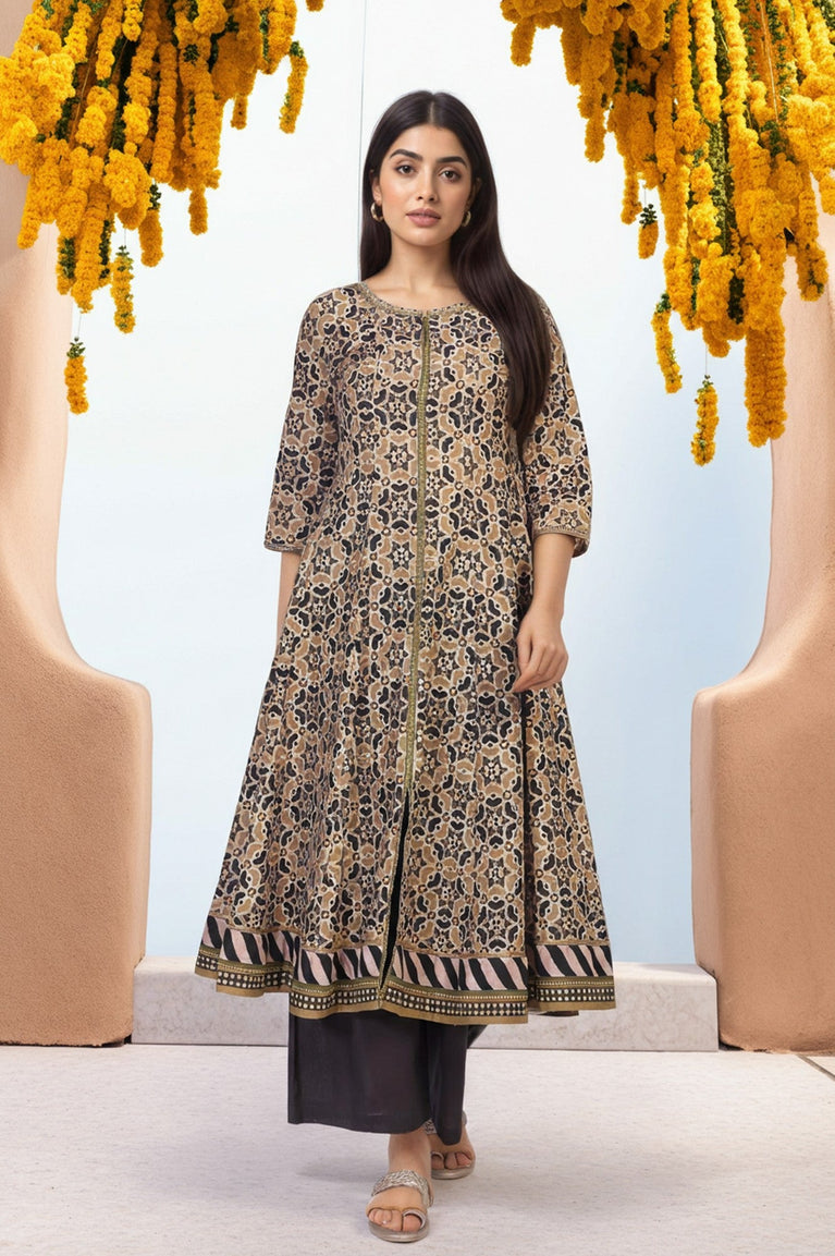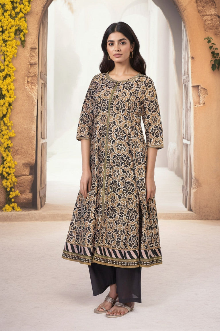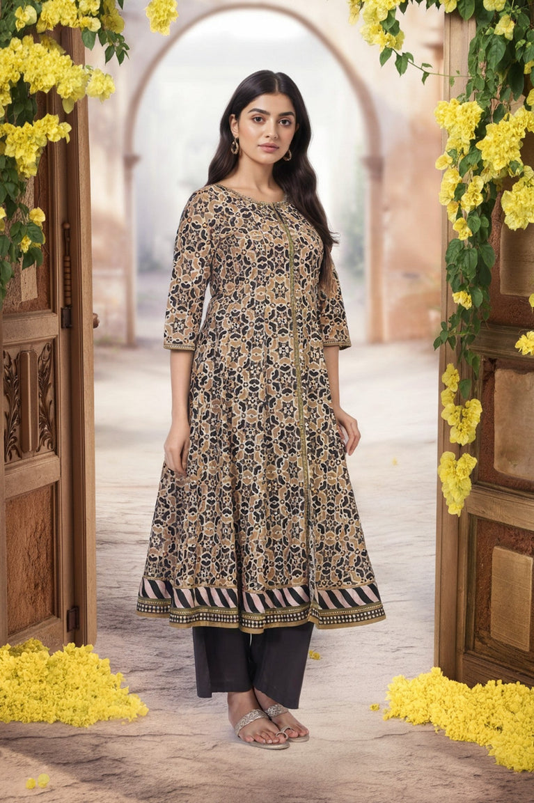 An ode to traditional artistry, this piece feels like a story woven into fabric. It's the kind of garment that makes an impression with its graceful movement and intricate design. This stunning Anarkali kurta for women is a perfect blend of comfort and festive charm, designed for those who appreciate detailed craftsmanship. The silhouette flows beautifully from a fitted bodice, featuring a classic round neckline that descends into an embellished front placket, adding a touch of subtle shimmer. Its comfortable three-quarter sleeves are finished with a complementary border, echoing the detailed pattern found at the wide, flared hemline which swirls with every step. Crafted from a breathable, opaque fabric, this apparel ensures you stay comfortable while looking your best. The all-over ethnic print, rendered in a sophisticated palette of earthy beige and deep black, makes this Anarkali kurti a versatile choice for any daytime celebration. You'll find it's more than just a printed cotton dress; it's a statement of effortless elegance. This package contains one masterfully designed kurta.
