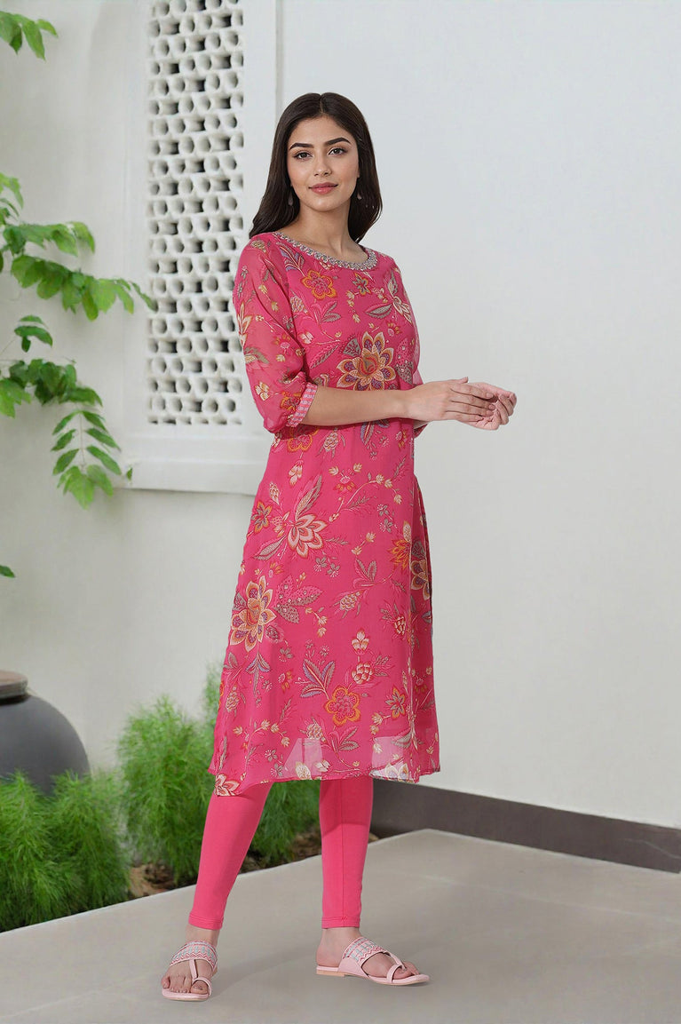 Pink Floral Printed Chiffon A-Line Kurta and Tights Set