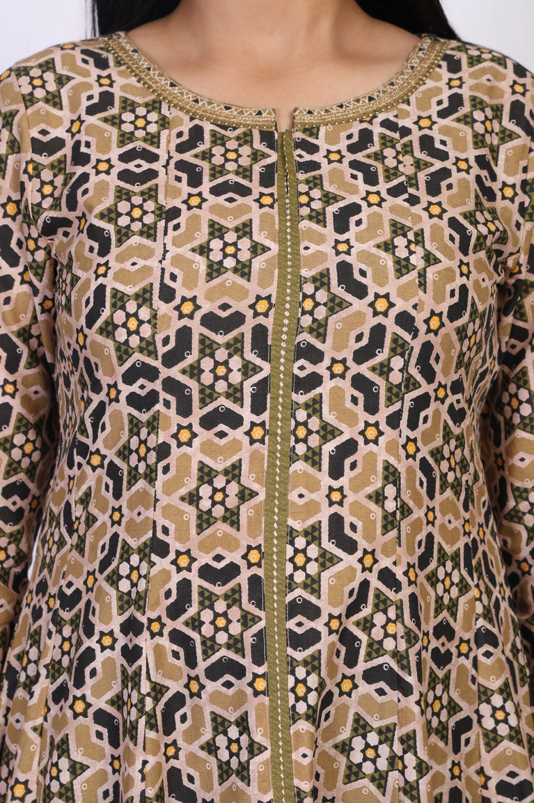 A portrait of heritage and modern grace, this Anarkali kurta set for women is a masterpiece of sophisticated design, perfect for those who appreciate artisanal details. The ensemble features a beautifully flared tunic, rendered in a striking geometric block print that dances across the premium cotton fabric in a palette of earthy beige, deep black, and muted olive. It’s an ethnic co-ord set that tells a story with every motif. You’ll absolutely adore the elegant round neckline, which is delicately highlighted with fine, lustrous embroidery that traces a central front placket. This detail flows seamlessly into a contemporary full-length front slit, a modern touch that adds both visual intrigue and graceful movement to the classic Anarkali silhouette. The comfortable three-quarter sleeves are finished with a simple, clean hem, complementing the ensemble's refined aesthetic. This exquisite kurti set ensures all-day comfort without compromising on style. At the flared hemline, a broad, contrasting border featuring bold stripes provides a perfect visual anchor to the intricate all-over pattern. The set includes a pair of solid, dark-toned parallel pants that offer a sleek, comfortable fit, perfectly balancing the volume of the kurta. This opaque, two-piece set is a testament to timeless elegance.