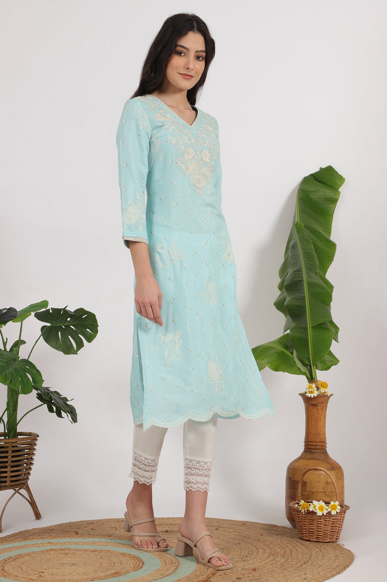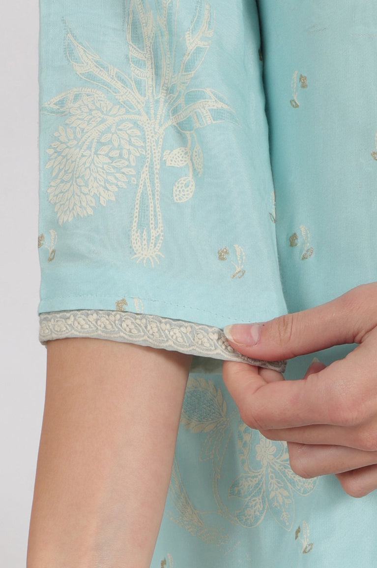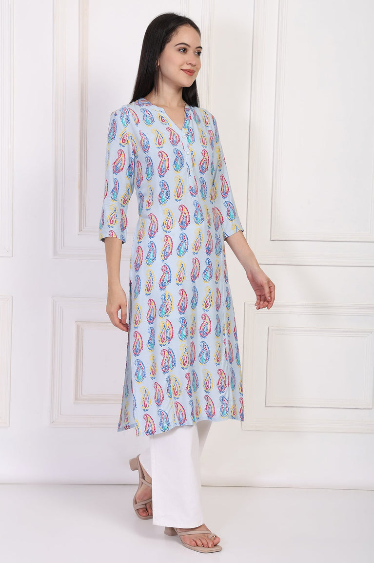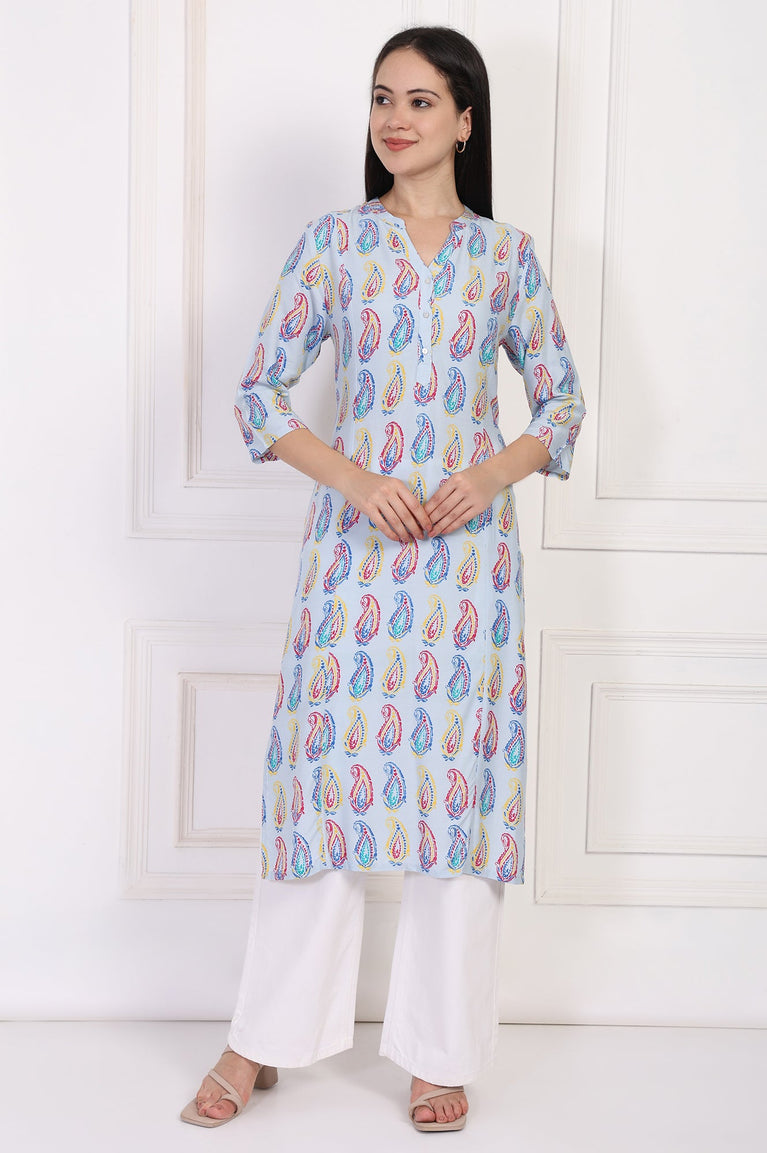 A canvas of classic artistry, this kurta for women is rendered in a refreshing Sky Paisley Blue, bringing a touch of handcrafted charm to your wardrobe. The design celebrates timeless motifs with its vibrant, all-over paisley print, making this tunic a standout piece of apparel for any casual occasion you have planned. You'll love how it's shaped into a graceful straight silhouette that flatters every form, ending in a classic straight hemline complete with side slits that offer beautiful movement and all-day ease. The neckline is a thoughtfully designed Mandarin collar, which flows elegantly into a V-placket detailed with a row of delicate, contrasting buttons on the yoke for a hint of ornamentation. Its three-quarter sleeves provide comfortable and chic coverage, perfect for transitional weather. Crafted from a fabric that glides effortlessly and feels soft against the skin, this light blue ethnic tunic is fully opaque, ensuring total confidence with every wear. It’s the perfect paisley print kurta to pair with crisp white trousers or your favorite denim for a look that's both sophisticated and wonderfully easygoing. This single-pack kurta is a testament to understated style, blending traditional patterns with a modern, wearable cut.