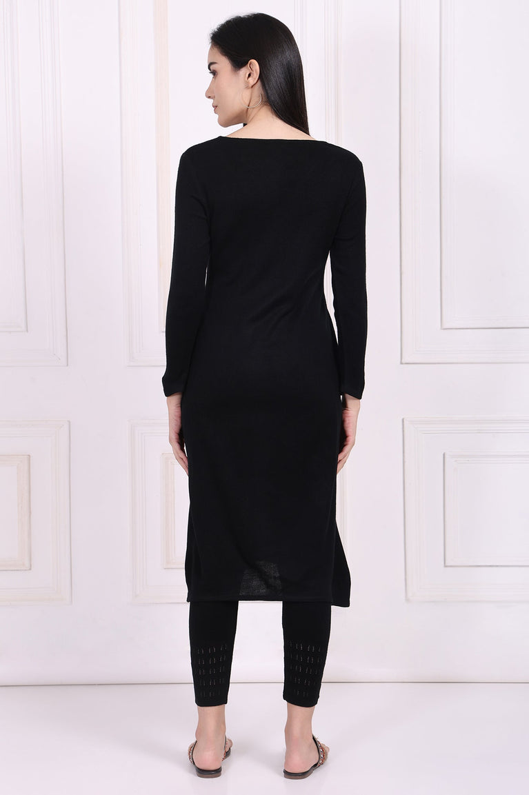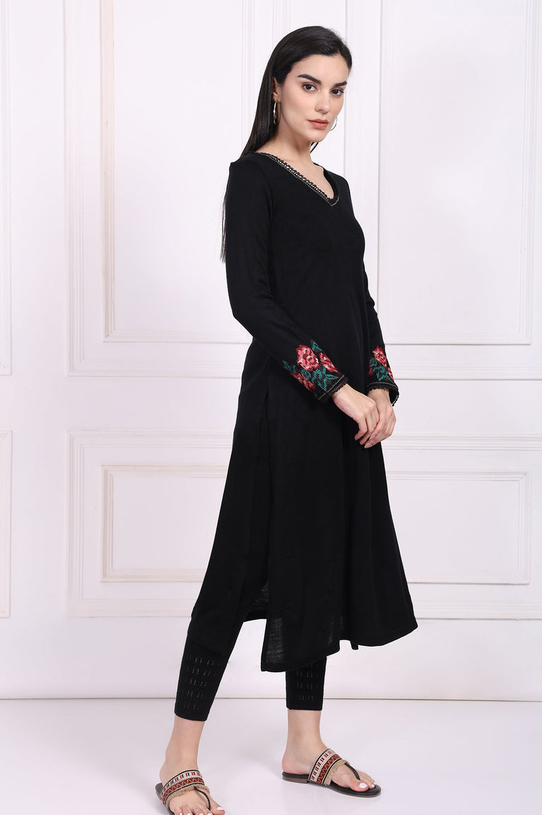 A statement of refined comfort, this gorgeous kurta for women is designed to become a winter wardrobe staple. Presented in a deep Midnight Black, it offers a canvas of classic elegance. The focal point is the beautifully detailed V-neckline, which features a rich tapestry of floral embroidery blossoming across the yoke in warm, inviting tones. This garment is meticulously crafted from a soft, warm knit, ensuring you stay cozy without sacrificing style. Its straight silhouette flows effortlessly to a clean, straight hemline, creating a look that is both flattering and timeless. With full sleeves for complete coverage and a fully opaque finish for modesty, it's a piece you'll reach for again and again. This embroidered acrylic kurti is more than just an outfit; it’s an experience in sophisticated comfort. Perfect as a versatile tunic for women, it seamlessly transitions from a day at the office to a quiet evening gathering, proving that true style lies in the details. It's a single, powerful piece that promises endless styling possibilities.