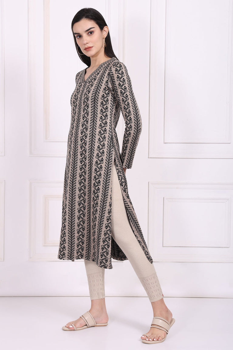 A whisper of winter elegance is woven into every fiber of this stunning piece. This isn't just another kurta for women; it's a statement of cozy sophistication designed for the modern style enthusiast. The color palette, a refined interplay of Toasted Almond and deep Onyx, brings the intricate, yarn-dyed geometric pattern to life. Your eye is first drawn to the graceful V-neckline, designed to flatter as it flows into a gentle A-line silhouette that drapes beautifully. Full-length sleeves offer warmth and an elegant line, culminating in a simple, unadorned finish. With no defined yoke, the verticality of the pattern creates an elongated, slimming effect. The border is a natural conclusion of the woven design, keeping the look clean and cohesive. Fully opaque, this garment offers complete coverage and confidence. A straight hemline with functional side slits allows for graceful movement. This single-piece apparel is your go-to A-line acrylic tunic for everything from crisp morning commutes to relaxed weekend brunches. It’s the kind of winter ethnic wear that feels both timeless and perfectly now.