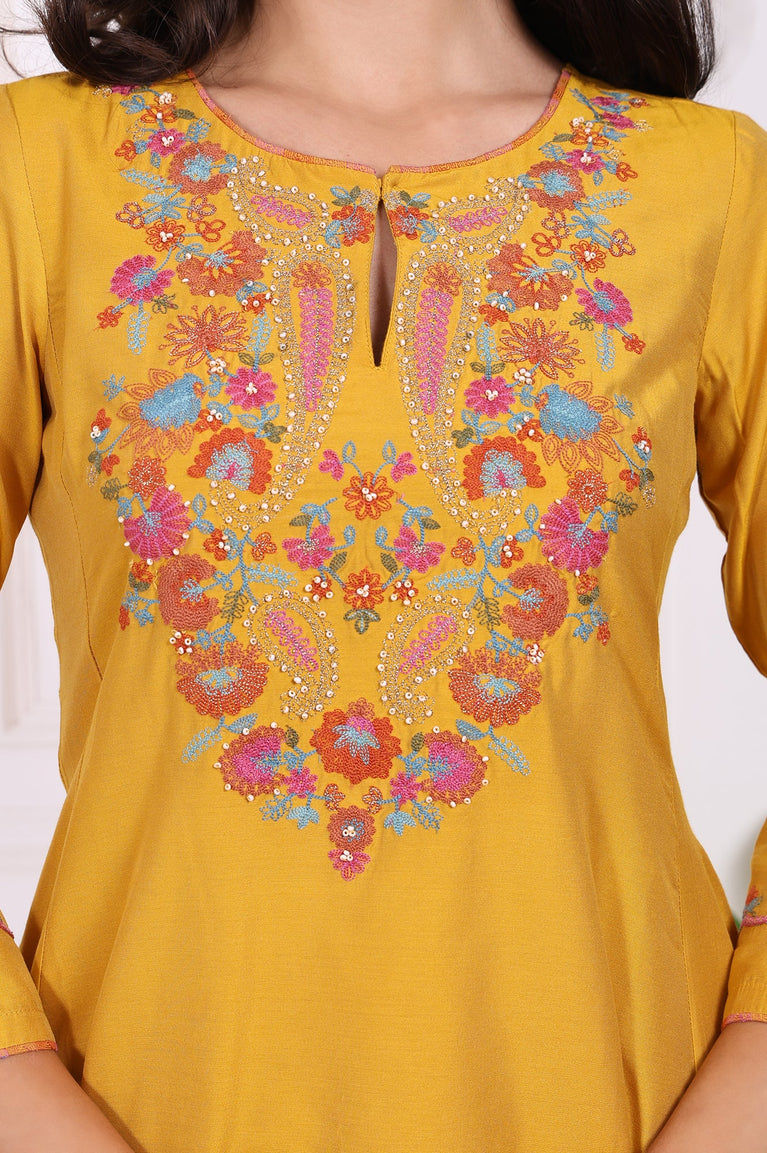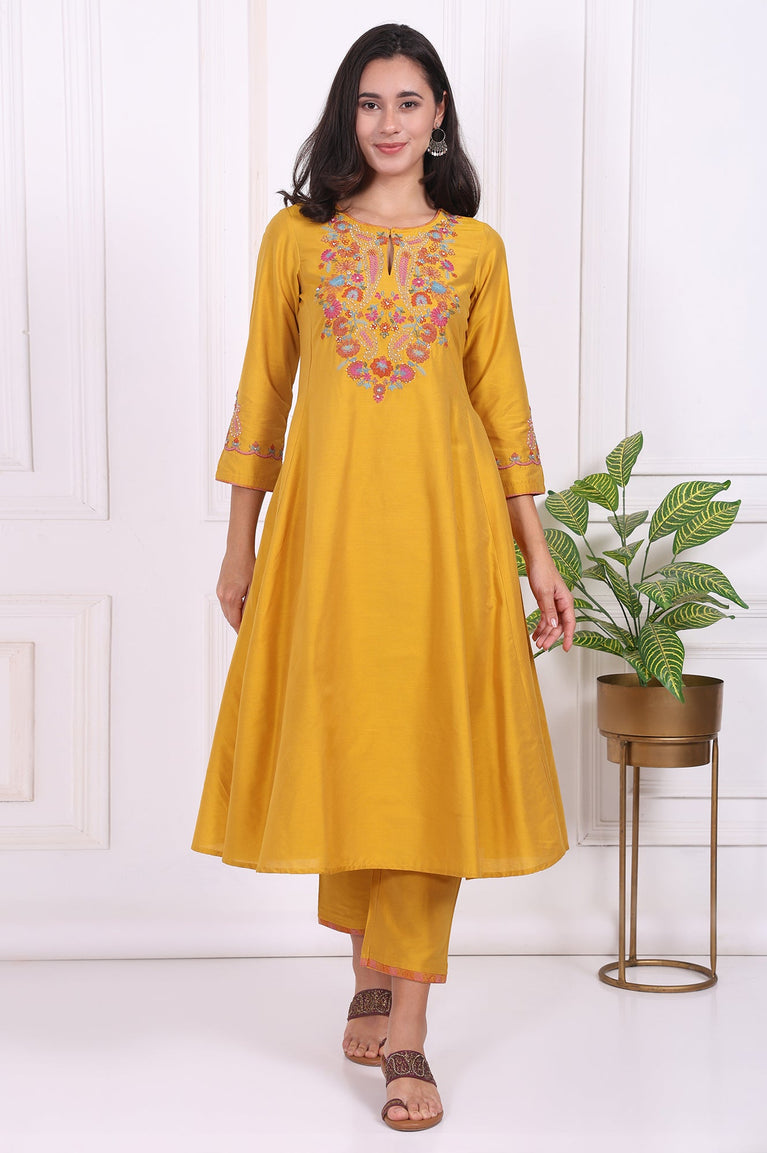 A vibrant yellow silk kurta adorned with intricate floral embroidery, perfect for festive occasions. The flared silhouette and three-quarter sleeves add a touch of elegance, while the round neckline ensures comfort. Pair it with gold-toned accessories for a complete ethnic look.