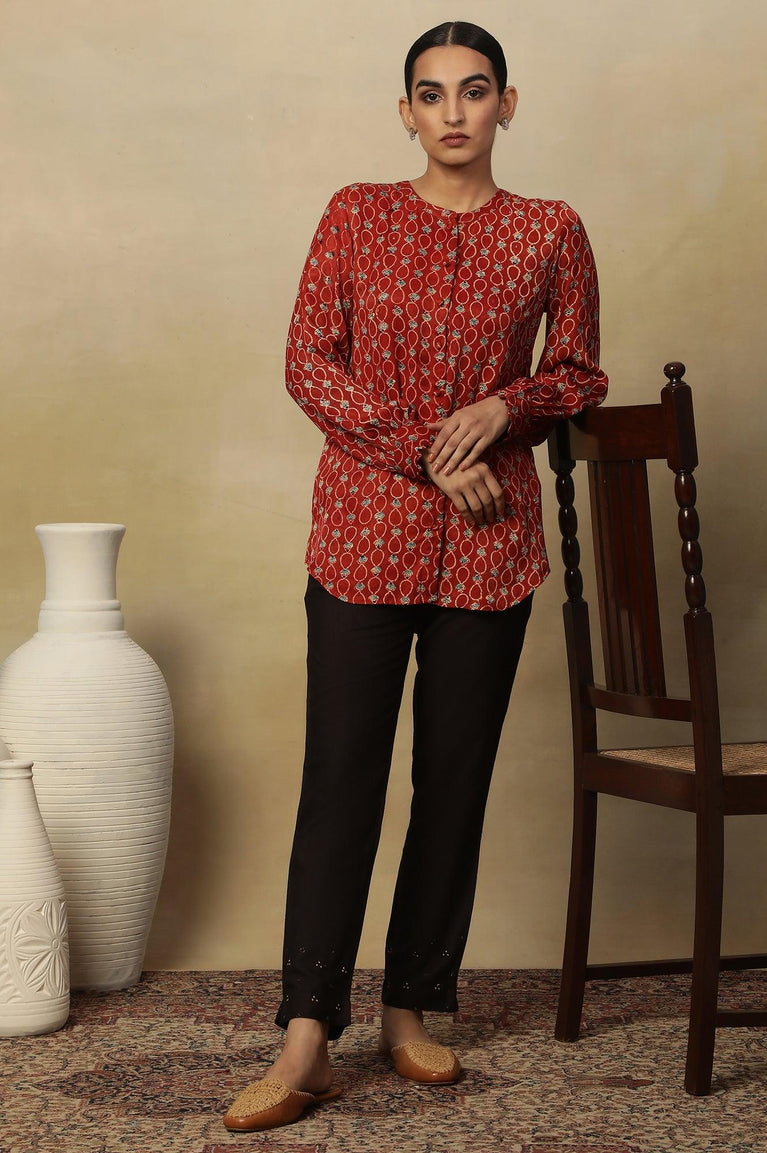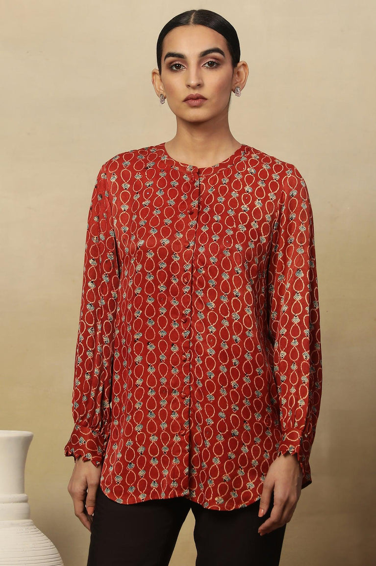 Brick Red Ajrakh Print Top In Lustrous Satin