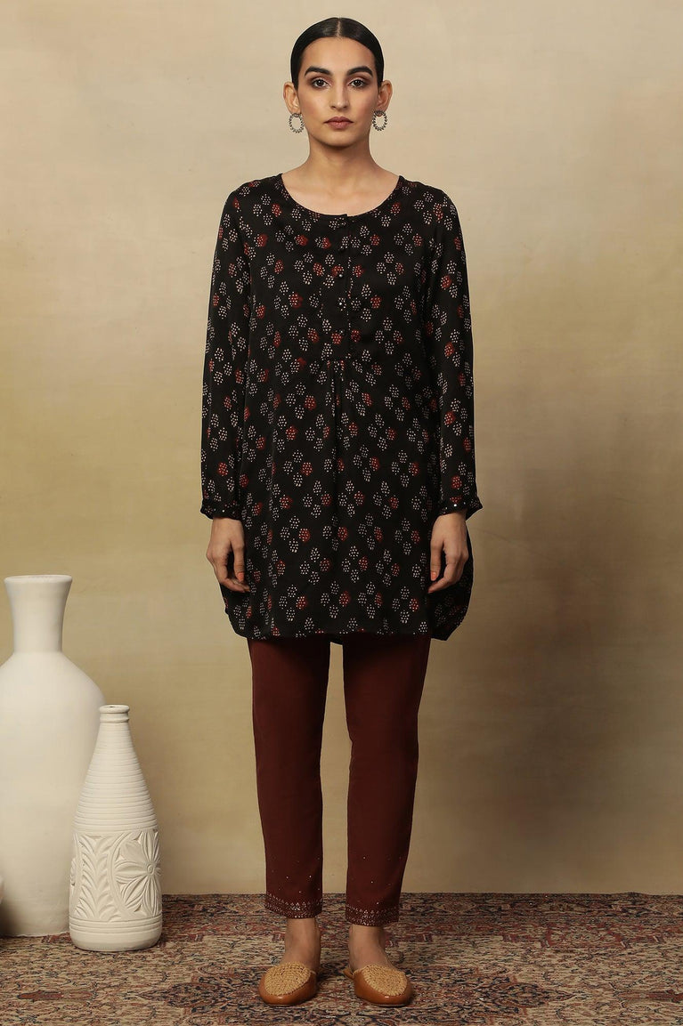 Black Ajrakh Dot Print Round Neck Long Top In Fluid Satin