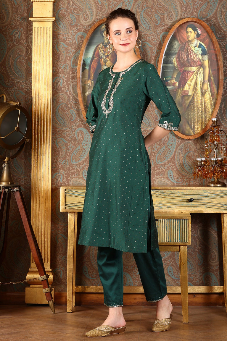 Bottle Green Glitter Printed Kurta With Embroidered Yoke