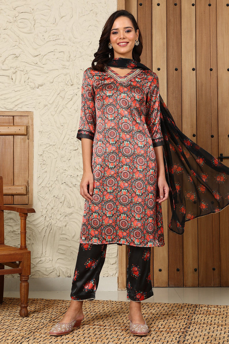Black Floral Printed Japenese Satin Embroidered A-Line Kurta And Pants Set With Dupatta