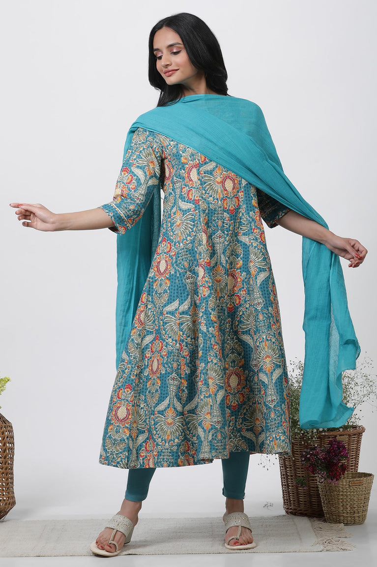 Blue Multicolored Floral Hand Block Print Kurta