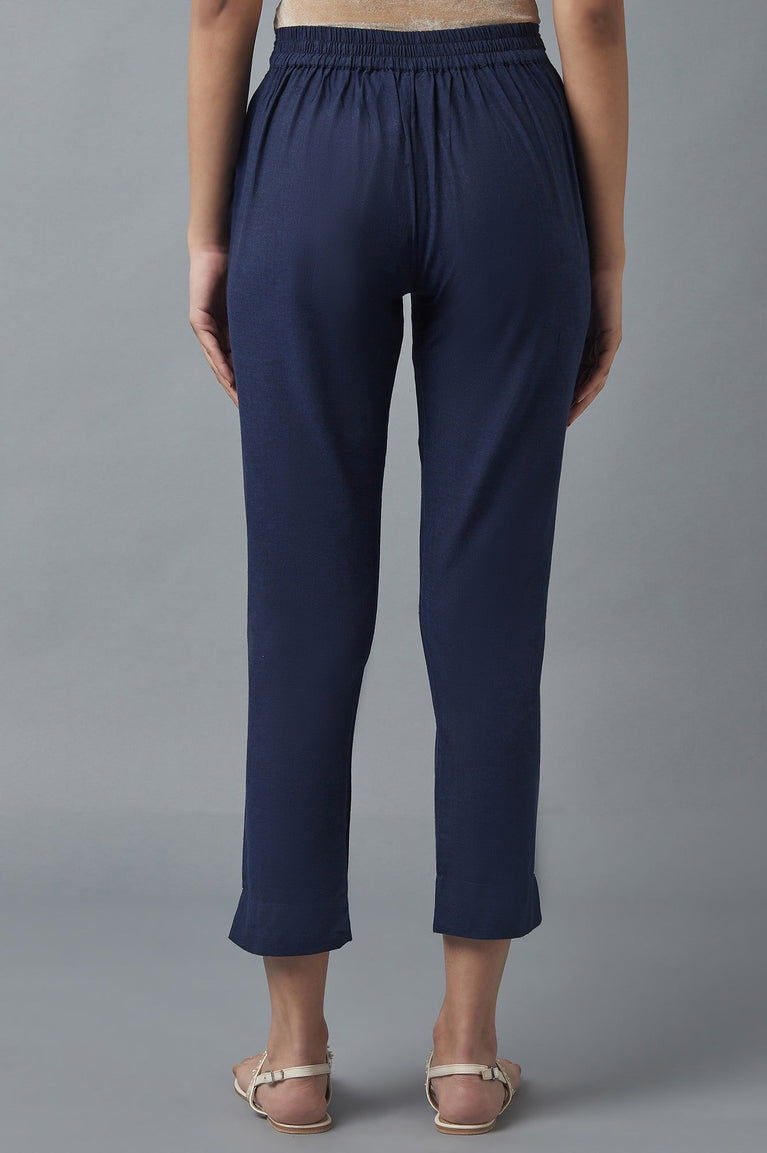 Navy Blue Solid Straight Fit Cotton Pants With Elasticated Waistband