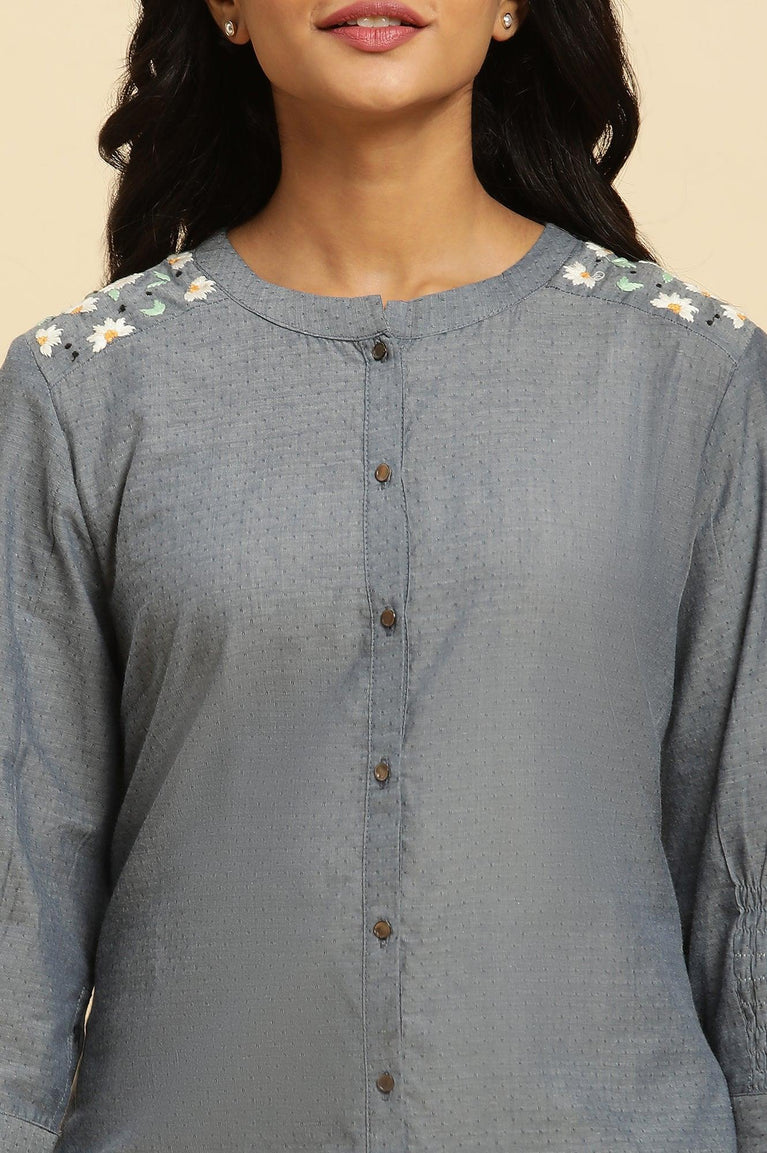 Elevate Your Casual Look In This Classy Blue Shoulder Embroidered Tunic. It Has Mandarin Collar And Button Placket.