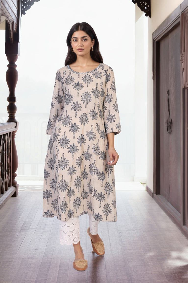 Beige Kalamkari Mirror Work A-Line Cotton Kurta