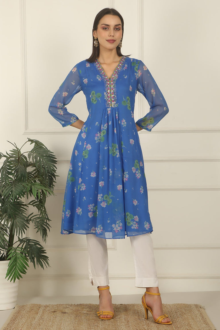 Channel graceful charm in this Blue Floral Printed Gathered Kurta, tailored in airy chiffon fabric for a soft, flowy drape. The vibrant floral print adds a refreshing pop of color, while the gathered design flatters every silhouette. A delicately embellished yoke tab featuring fine beadwork brings just the right amount of sparkle, making it perfect for daytime outings or festive evenings. Style it with delicate earrings and strappy flats for an effortlessly chic look.