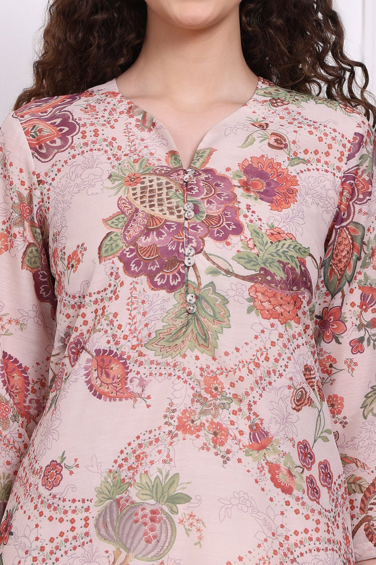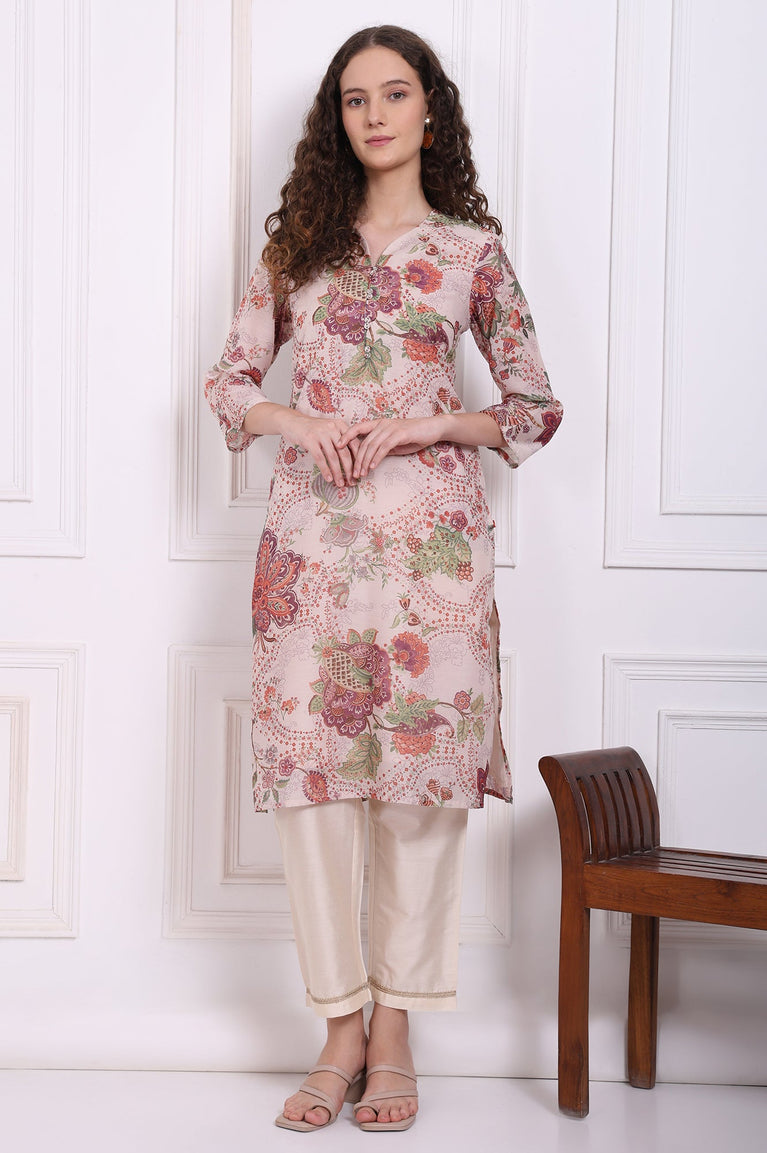 Beige Floral Print Lace Trim A-Line Modal Kurta
