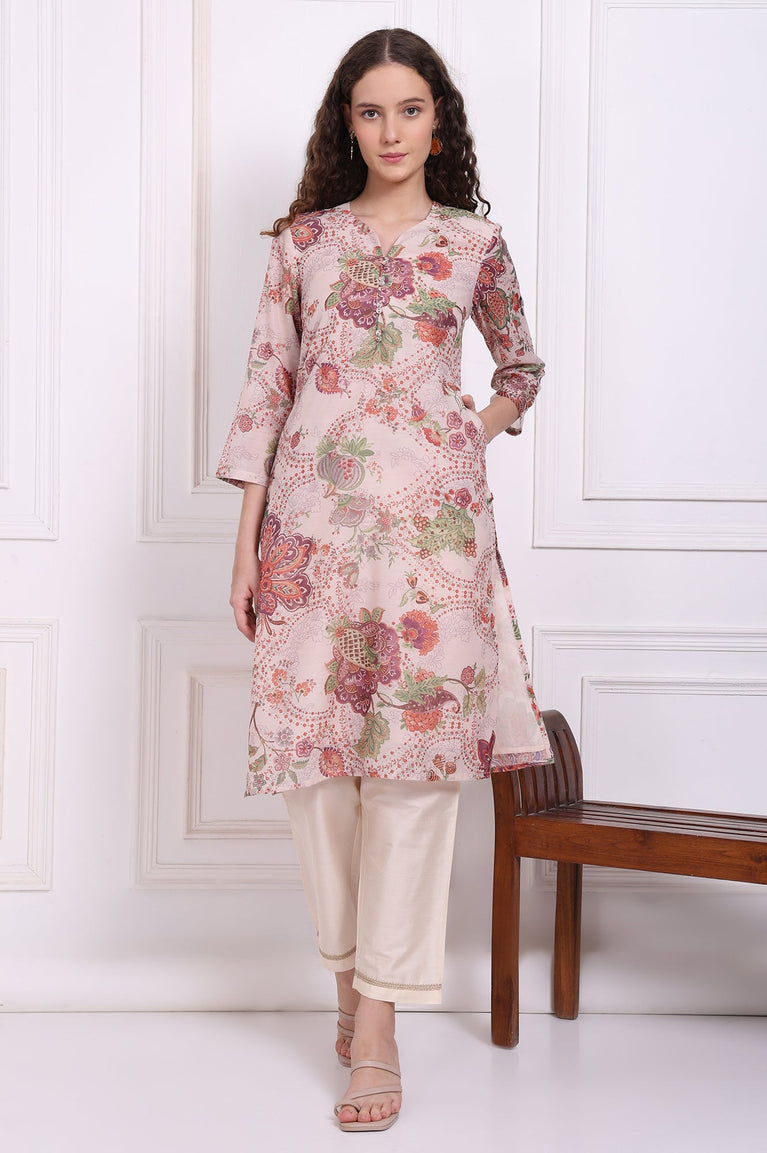 Embrace timeless elegance with this beige chanderi kurta for women, designed for effortless grace and everyday sophistication. Made from lightweight and breathable Chanderi fabric, the kurta features a soft beige base adorned with subtle floral prints, giving it a refined yet fresh appeal. The straight silhouette offers a flattering fit for all body types, while minimal detailing keeps the look chic and versatile. Perfect for workwear, casual outings, or festive luncheons, this kurta can be paired with straight pants or palazzos for a complete ethnic look.