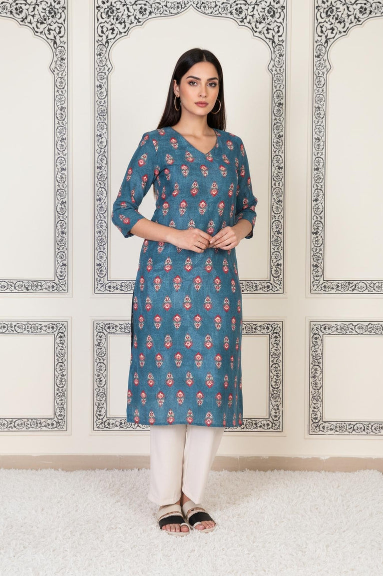 Effortlessly chic and versatile, this blue floral printed straight kurta is crafted from breathable cotton for all-day comfort. The V-neckline and three-quarter sleeves add a touch of elegance, while the straight silhouette ensures a flattering fit. Perfect for casual outings, office wear, or festive occasions, this kurta pairs beautifully with white palazzos or leggings. Its vibrant floral print and lightweight fabric make it a must-have for your wardrobe. Easy to maintain, simply machine wash to keep it looking fresh and stylish.