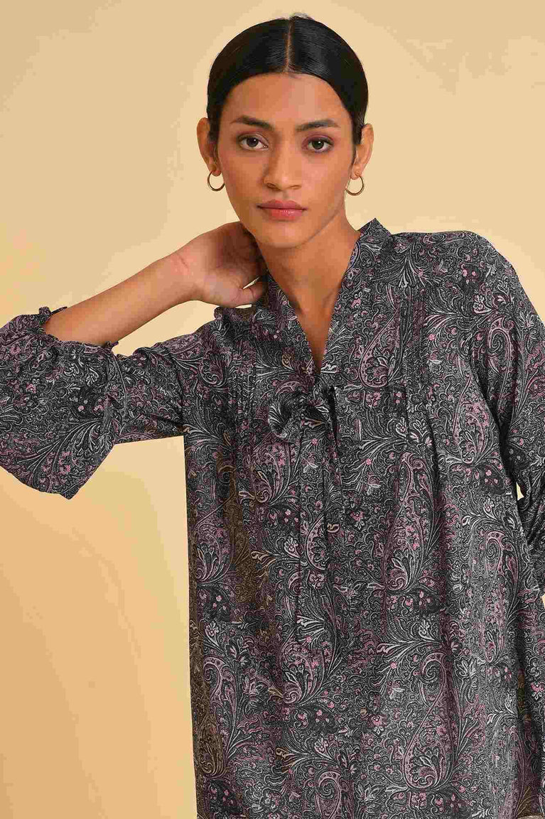 Get The Pretty Modern Look In This Stylish Black Top. The Top Has Paisley Print All Over And Tie-Up On Neckline.