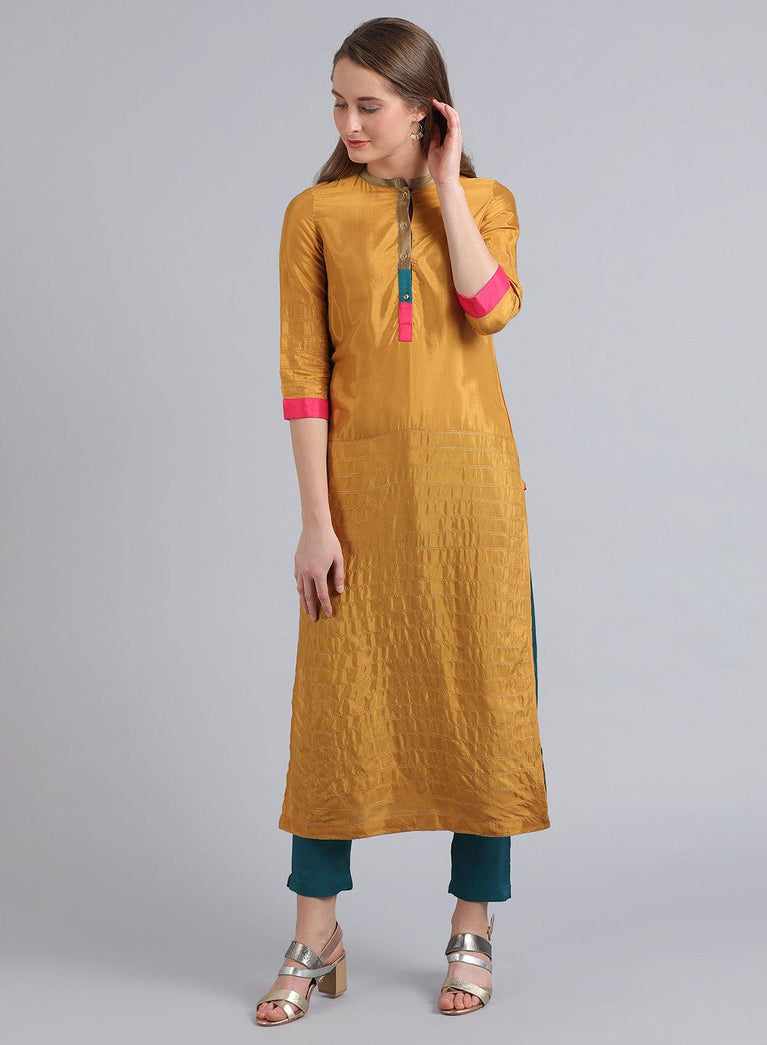 Beige straight kurta in key hole neckline with embroidery and organza detail in the neck.