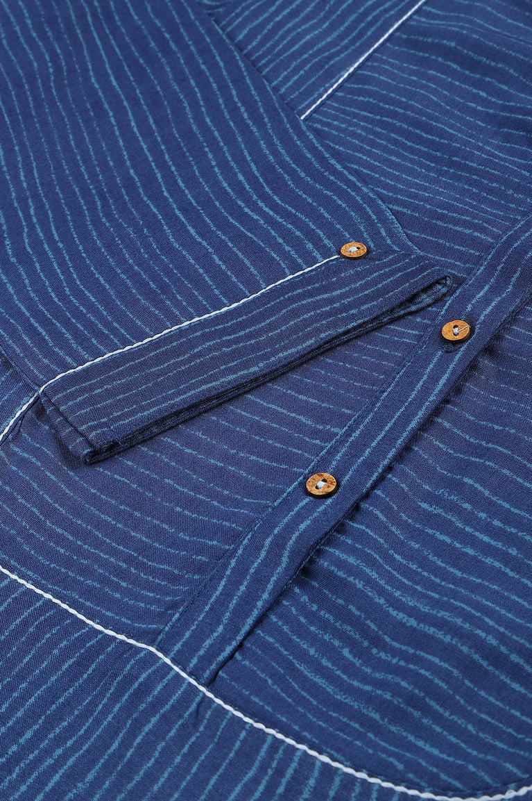 Pinstripe Blue Printed Kantha Stitch Yoke With Turn Up Sleeve kurta
