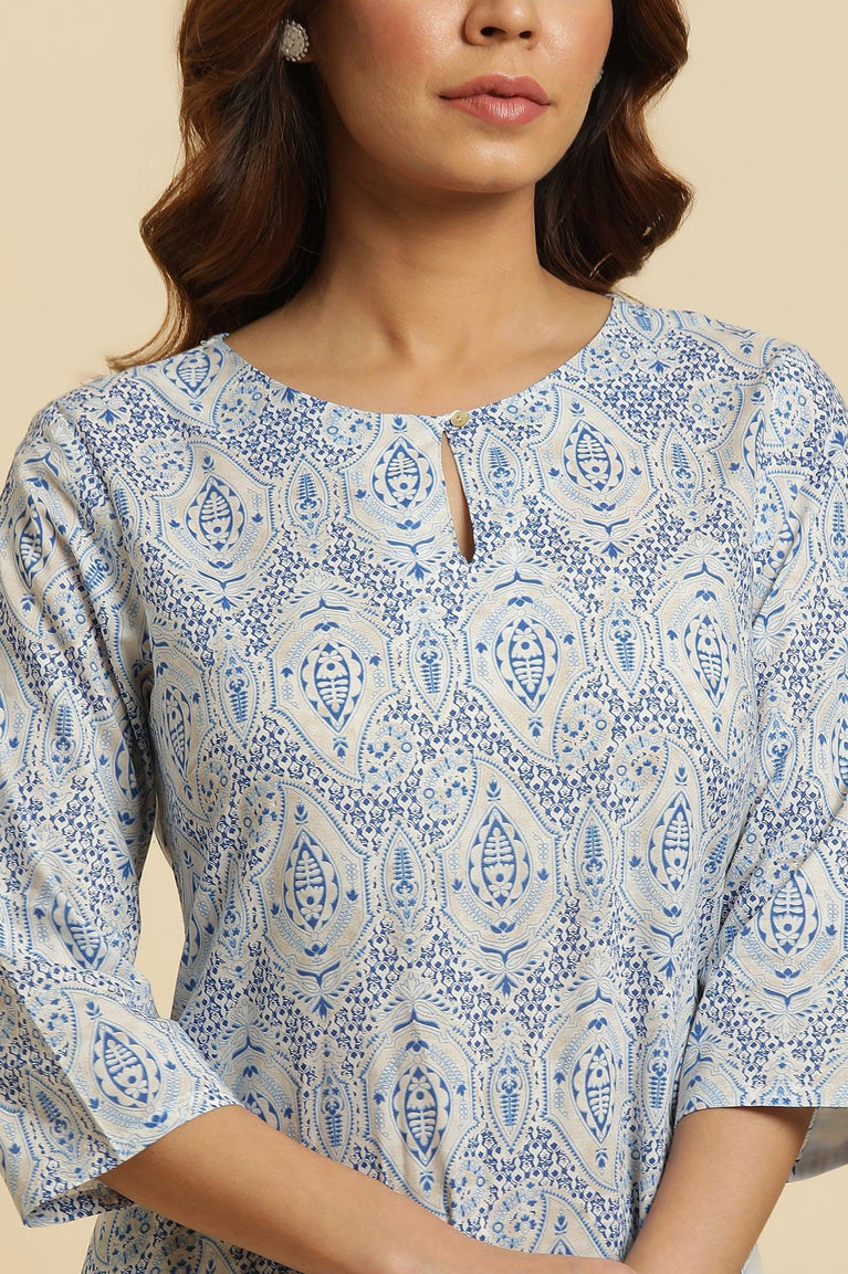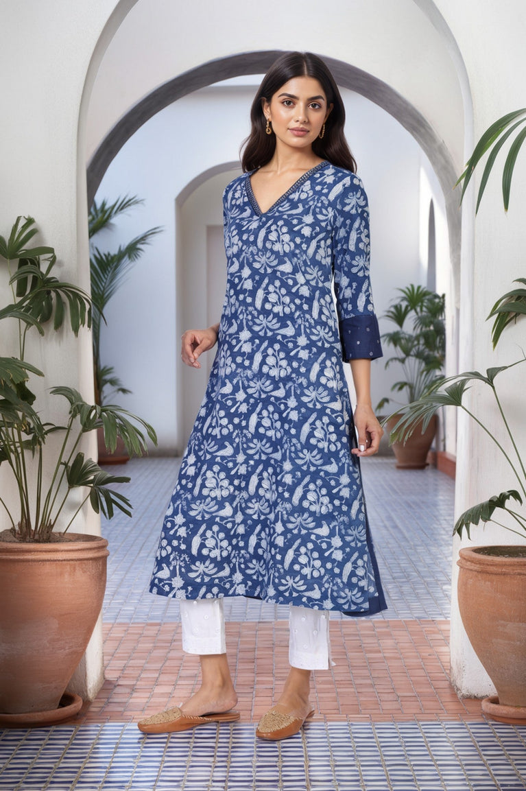A timeless addition to your wardrobe, this blue block print kurta is crafted from breathable cotton voile. The V-neckline is adorned with mirror work, adding a touch of elegance. Its straight silhouette, 3/4th sleeves, and side slits make it perfect for casual and festive occasions. Pair it with white palazzos and silver accessories for a complete ethnic look.