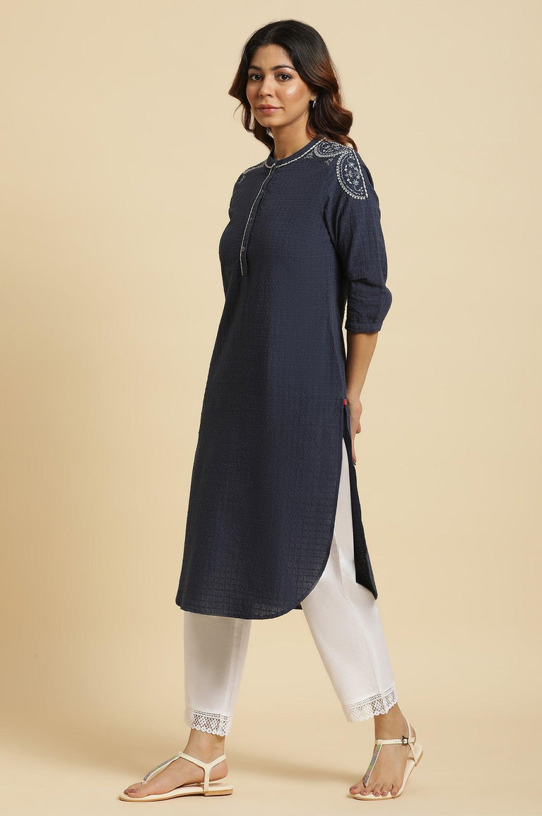 Midnight Blue Straight Kurta With A Curved Hemline Crafted In Textured Cotton Dobby. It Has A Mandarin Collar And Chunky Contrast Thread Embroidery On The Shoulders. The Kurta Also Features Side Pockets.