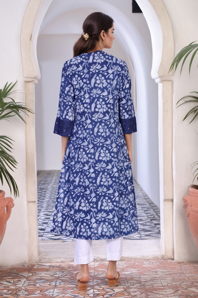 Blue Block Print Mirror Work Flared Cotton Kurta