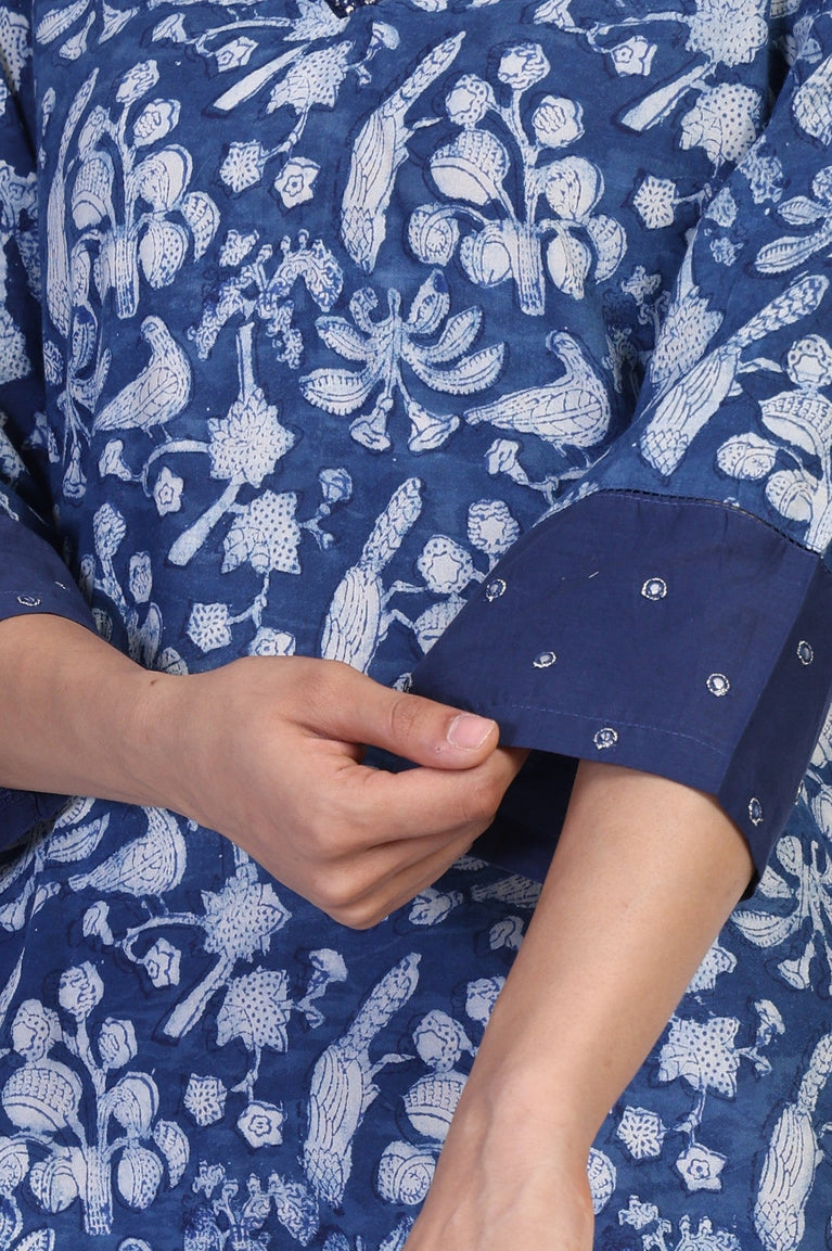 Blue Block Print Mirror Work Straight Cotton Kurta