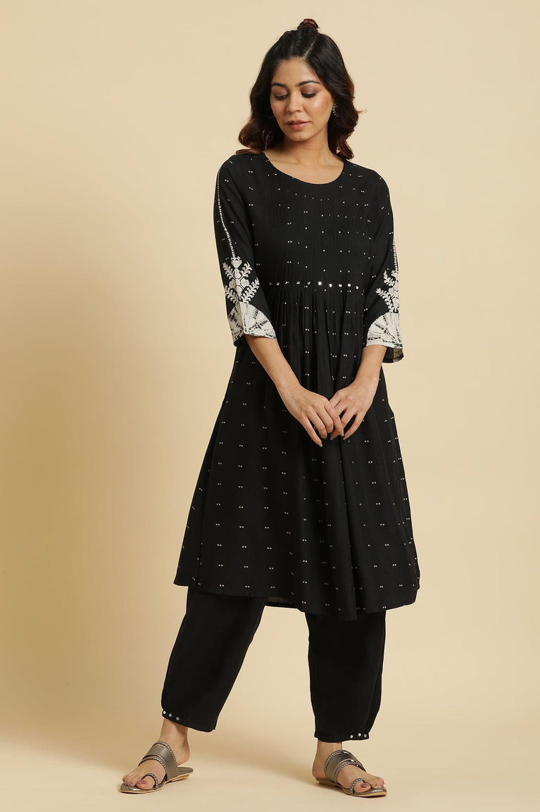 Black Glitter Printed Rayon Straight Kurta with Embroidered Neck