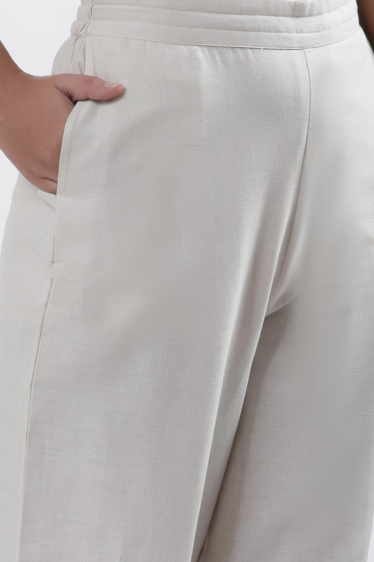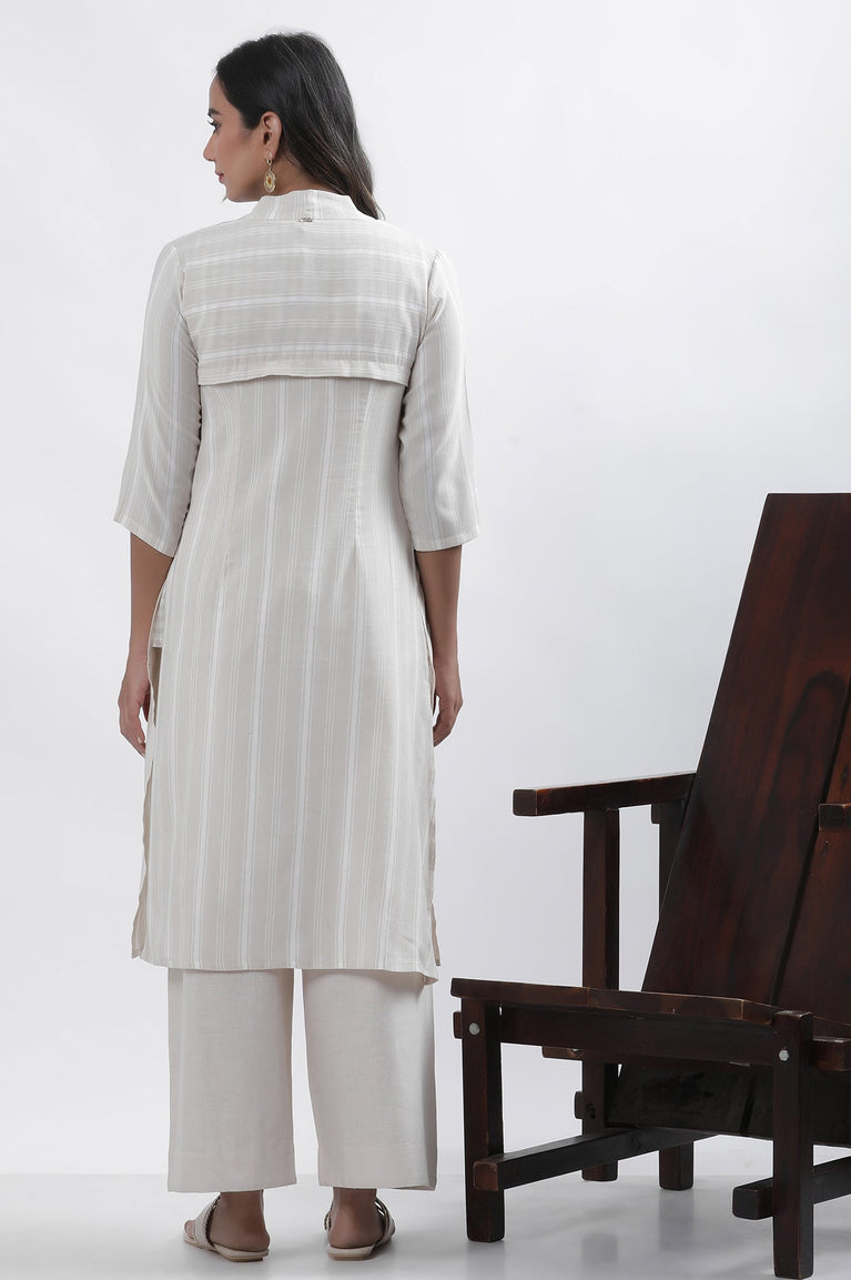 Beige Checkered Dobby Top & Jacket Set. This Sleeveless Top Is Paired With Straight Pants Crafted In Cotton Flax And With Striped Jacket To Complete The Look.