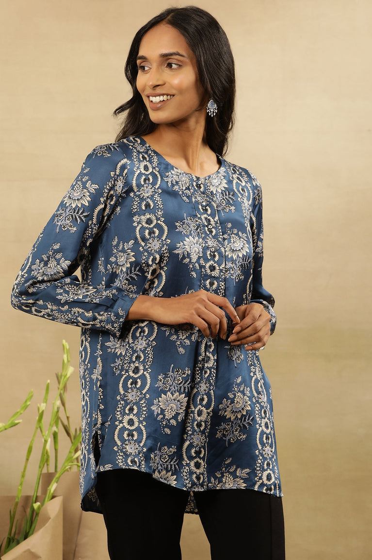 A Lustrous Modal Satin Top In Ajrakh Floral Print For Festive Occassions. Further Accented With Wide Placket With Gathers Below It And Mirror Work Buttons. Sleeves Has Pleats With Cuff.
