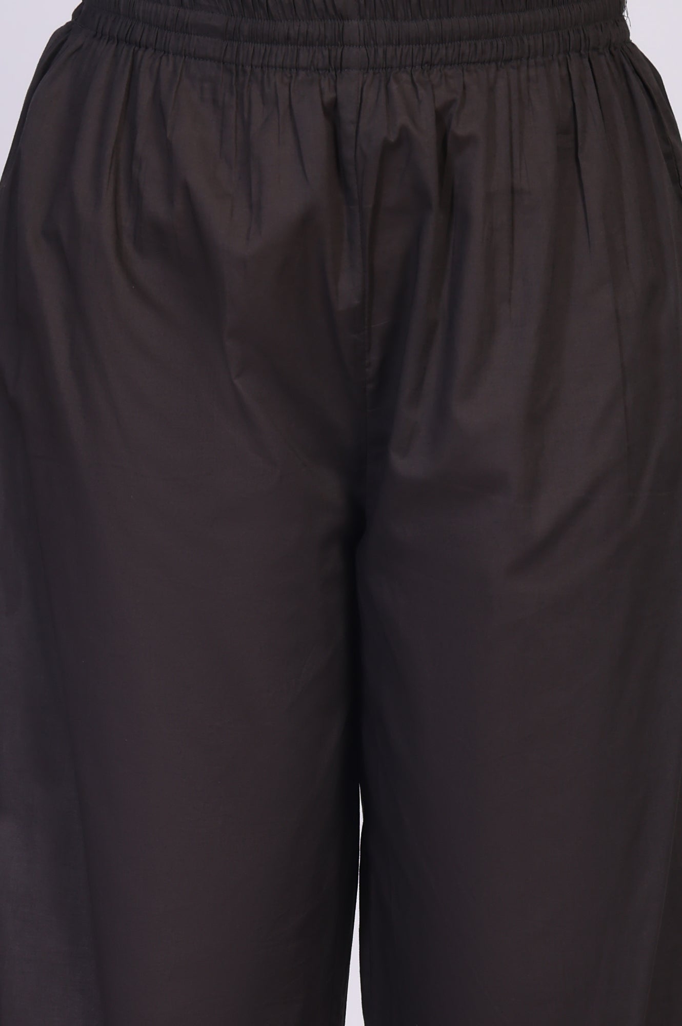 A portrait of heritage and modern grace, this Anarkali kurta set for women is a masterpiece of sophisticated design, perfect for those who appreciate artisanal details. The ensemble features a beautifully flared tunic, rendered in a striking geometric block print that dances across the premium cotton fabric in a palette of earthy beige, deep black, and muted olive. It’s an ethnic co-ord set that tells a story with every motif. You’ll absolutely adore the elegant round neckline, which is delicately highlighted with fine, lustrous embroidery that traces a central front placket. This detail flows seamlessly into a contemporary full-length front slit, a modern touch that adds both visual intrigue and graceful movement to the classic Anarkali silhouette. The comfortable three-quarter sleeves are finished with a simple, clean hem, complementing the ensemble's refined aesthetic. This exquisite kurti set ensures all-day comfort without compromising on style. At the flared hemline, a broad, contrasting border featuring bold stripes provides a perfect visual anchor to the intricate all-over pattern. The set includes a pair of solid, dark-toned parallel pants that offer a sleek, comfortable fit, perfectly balancing the volume of the kurta. This opaque, two-piece set is a testament to timeless elegance.