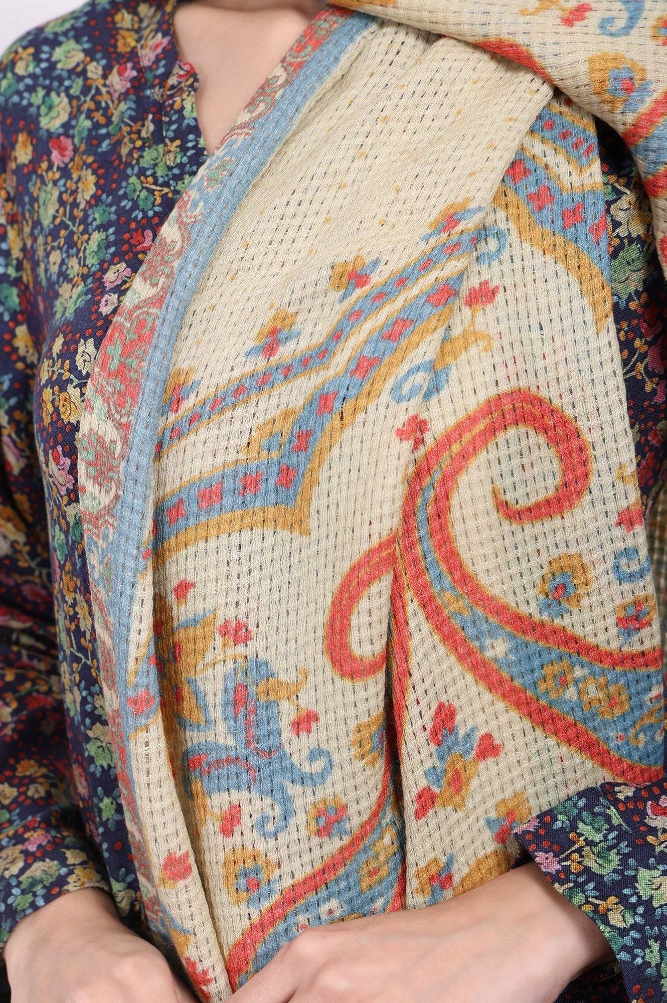 A whisper of heritage for the modern muse, this piece is more than just an accessory; it's a wearable story. This exquisite stole for women is a masterpiece of woven artistry, designed to be the crowning glory of your winter wardrobe. Crafted from a sumptuously soft and warm wool blend, its generous expanse—measuring 2 meters in length and 70 centimeters in width—offers versatile draping possibilities, feeling substantial yet wonderfully fluid against the skin. The completely opaque fabric showcases a breathtaking, all-over paisley pattern, a classic design reimagined in a sophisticated palette for today's discerning woman. A base of tranquil Ecru Sand provides the perfect canvas for intricate ethnic motifs that dance in vibrant shades of rich Teal, warm Mandarin, and deep Cerulean blue. This designer stole is a perfect example of a timeless ethnic shawl, making it an essential addition to your collection. It is ideal for elevating everything from a simple kurta to a contemporary dress. The intricate woven design is meticulously finished with short, delicate fringes along the ends, adding a touch of classic texture and graceful movement. Whether you're attending a festive celebration, a family gathering, or simply adding a layer of refined elegance to your daily ensemble, this woven winter wrap promises both comforting warmth and undeniable style. You’ll find yourself reaching for this versatile piece time and again.
