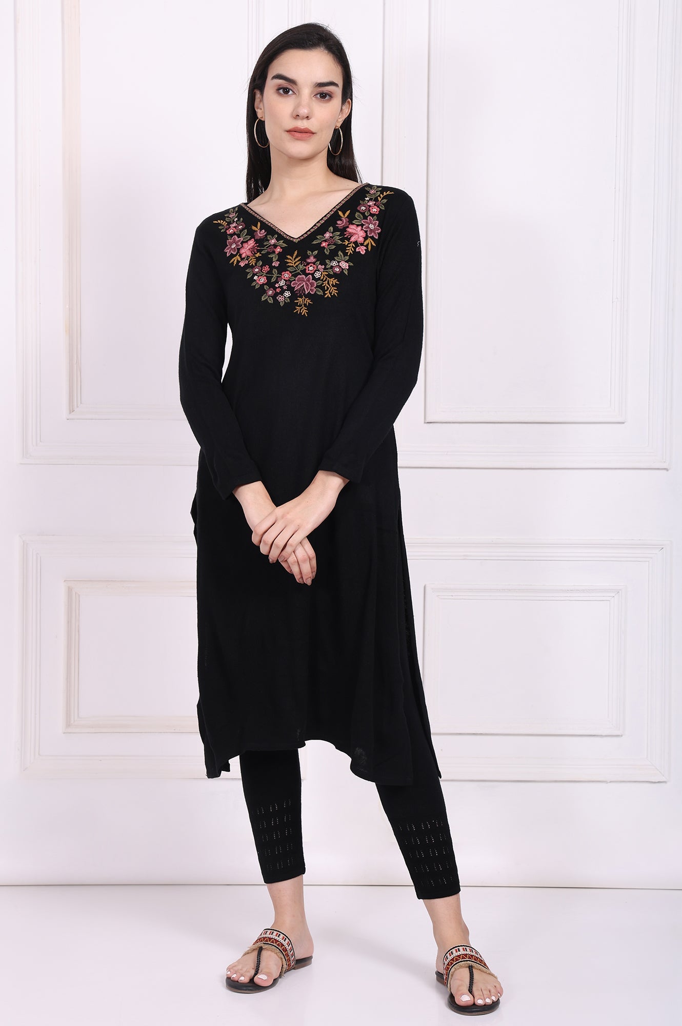 A statement of refined comfort, this gorgeous kurta for women is designed to become a winter wardrobe staple. Presented in a deep Midnight Black, it offers a canvas of classic elegance. The focal point is the beautifully detailed V-neckline, which features a rich tapestry of floral embroidery blossoming across the yoke in warm, inviting tones. This garment is meticulously crafted from a soft, warm knit, ensuring you stay cozy without sacrificing style. Its straight silhouette flows effortlessly to a clean, straight hemline, creating a look that is both flattering and timeless. With full sleeves for complete coverage and a fully opaque finish for modesty, it's a piece you'll reach for again and again. This embroidered acrylic kurti is more than just an outfit; it’s an experience in sophisticated comfort. Perfect as a versatile tunic for women, it seamlessly transitions from a day at the office to a quiet evening gathering, proving that true style lies in the details. It's a single, powerful piece that promises endless styling possibilities.