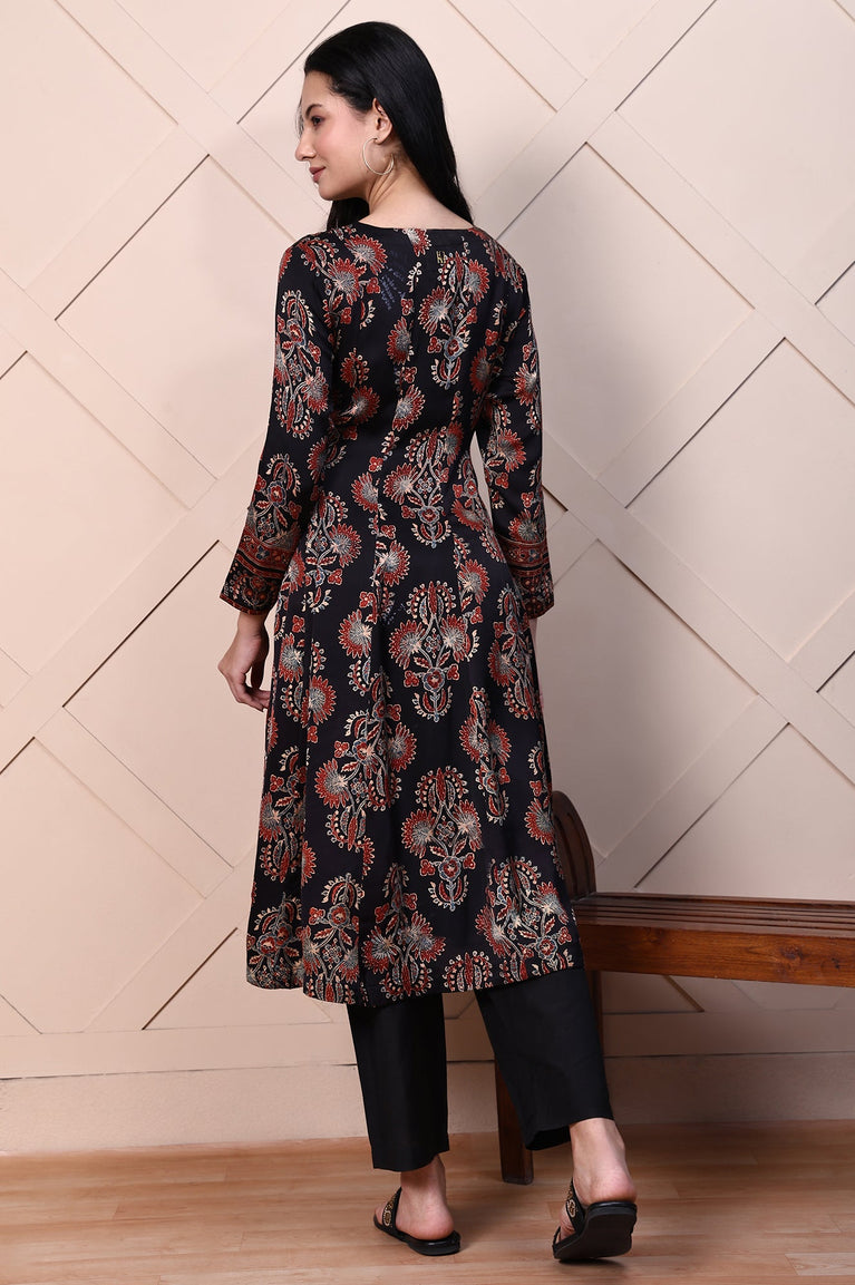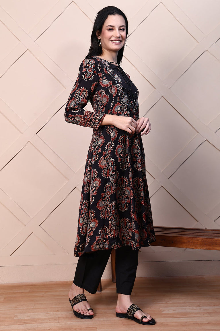 Black Ajrak Printed Satin Flared Kurta with Aari Embroidery on Yoke