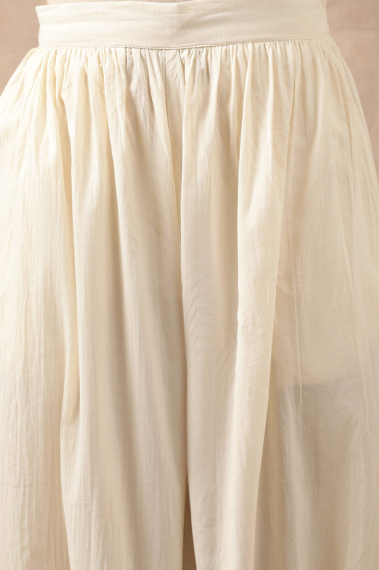 Softly tailored for effortless charm, these salwar pants for women feature a pleated hem design in Ecru. Crafted from breathable voile cotton, the relaxed fit ensures comfort while the mid-rise waistband adds a touch of elegance. Side slit pockets offer practicality, and the beaded ornamentation enhances the ethnic fusion appeal. Perfect for pairing with block-printed kurtas or cotton silk drapes, these salwar pants are a versatile addition to your wardrobe.