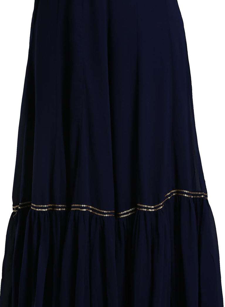 Going For A Date? Get Ready In This Pretty Floral Print Dark Blue Flared Dress. The Dress V-Neckline With Stitch Line Detailing. It Has Full Sleeves With Floral Print On It And Hemline. The Dress Comes With A Sling Back Having Metal Chain.