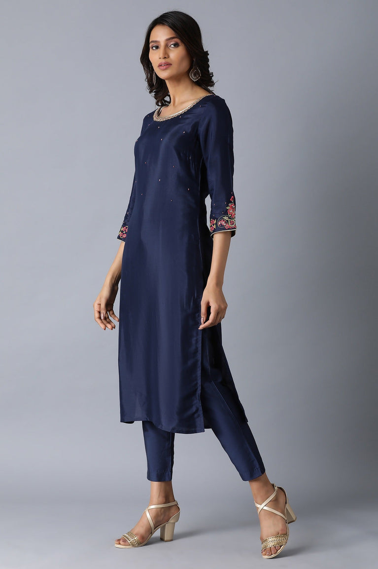 This Blue square neck 3/4 sleeve kurta has printed detail, side slits, border detail and straight hem.