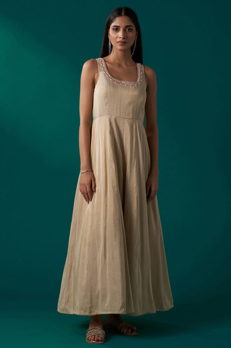 Beige Sequin Embroidered Long Jacket, Anarkali Dress and Churidar Set
