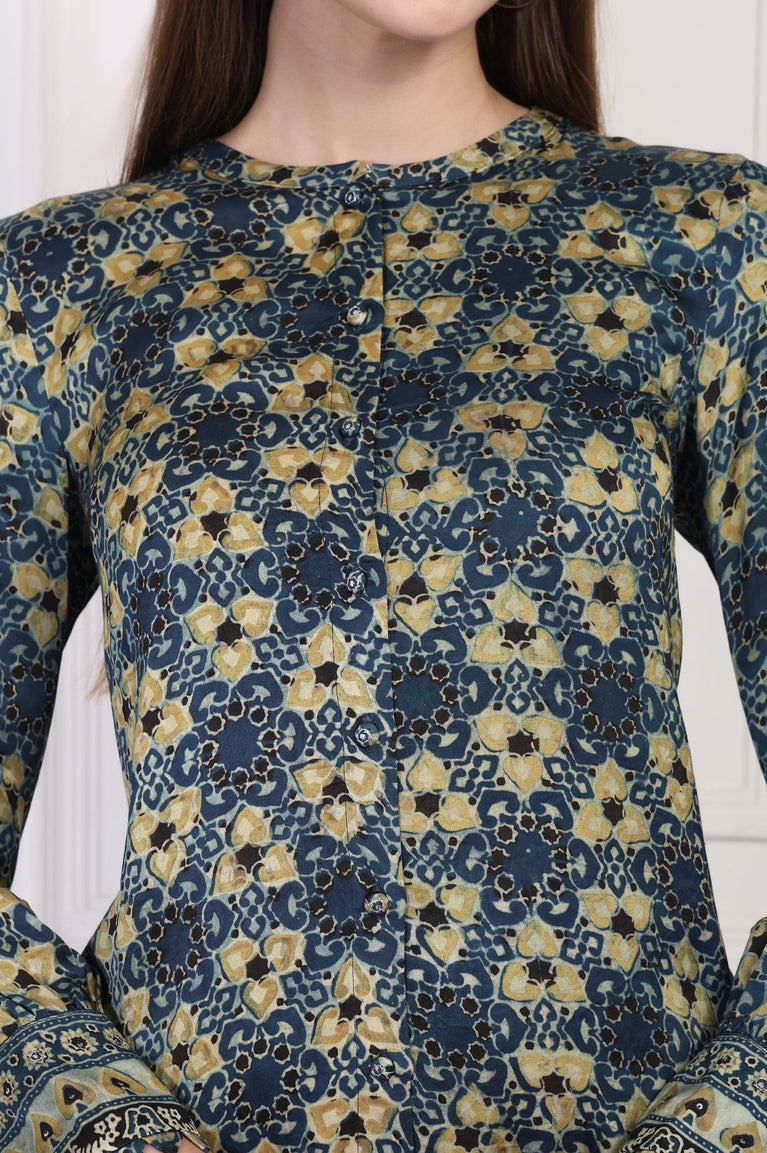 Effortlessly chic! This modal top for women features a captivating abstract print in a rich blue hue, complemented by a mandarin collar and long sleeves. The button-down design adds a touch of sophistication, while the straight silhouette ensures comfort and versatility. Perfect for casual outings or office wear, this breathable modal top is a must-have for your wardrobe. Pair it with tailored trousers or jeans for a polished look that transitions seamlessly from day to night.