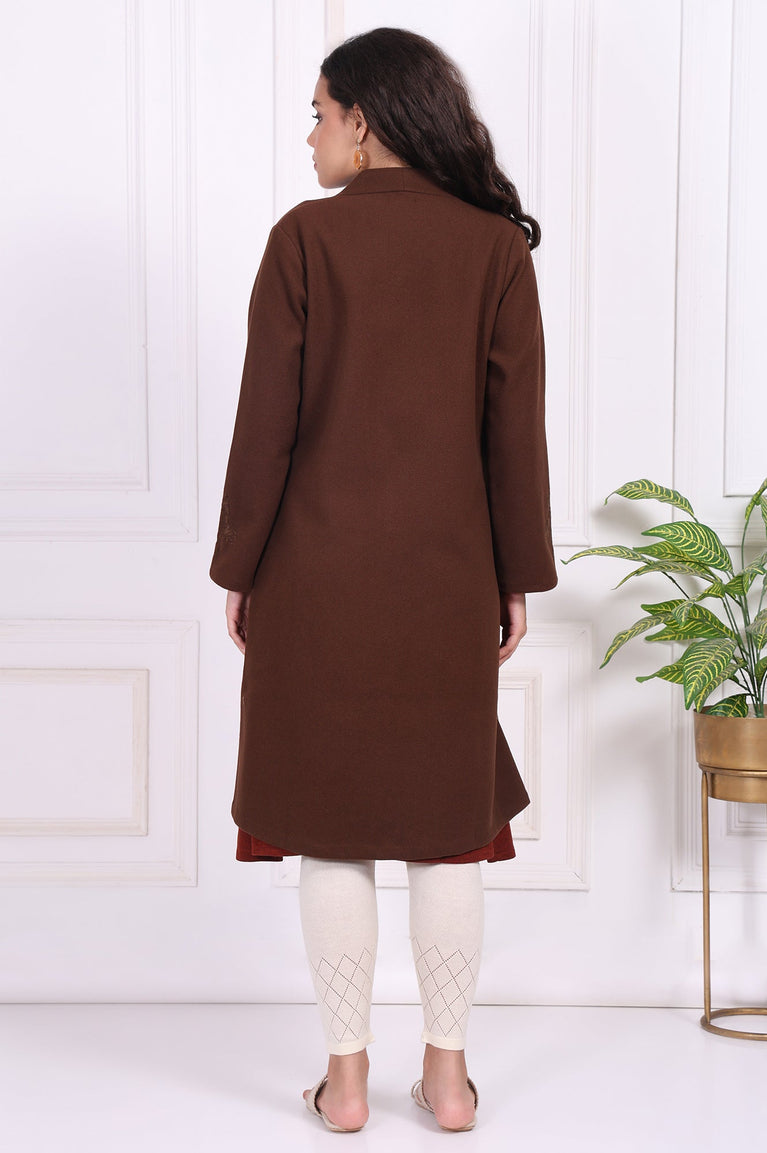Brown Solid Embroidered Straight Coat